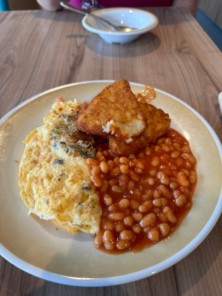 Even though we were on no timetable, we were awake bright and early at around 07:30. We took our time getting up and ready. Then we headed up to the Windjammer for some breakfast. Graham had oatmeal with dried fruit and sugar followed by fruit. As we were in no rush, I decided to have a made to order omelette with bacon, cheese, tomato and mushroom with a side of hash browns and baked beans. I really enjoyed this.