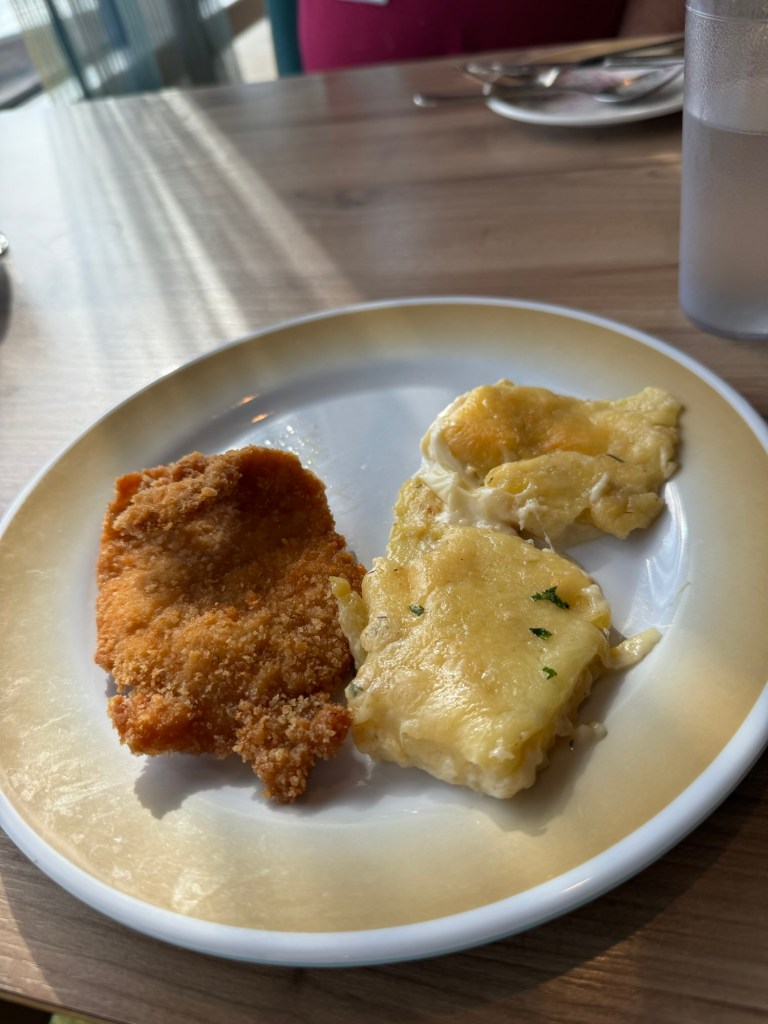 Once we had dried as much as we were going to, we took the towels back to the towel station and then headed back to the cabin. We got shower and changed. Then we headed back upstairs to get some lunch at the Windjammer. Graham got some steak with cheesy pasta and potato gratin. I got some stir-fried noodles from one of the life cooking stations. I then had a pork schnitzel with potato gratin. For his dessert, Graham had a piece of blueberry streusel pie and white chocolate cookie. Graham really liked the cookie. I decided to try a lemon cookie and white chocolate cookie. I was disappointed. Normally I love the cookies on Royal Caribbean as they are soft and gooey. The cookies this time were more the texture of shortbread.