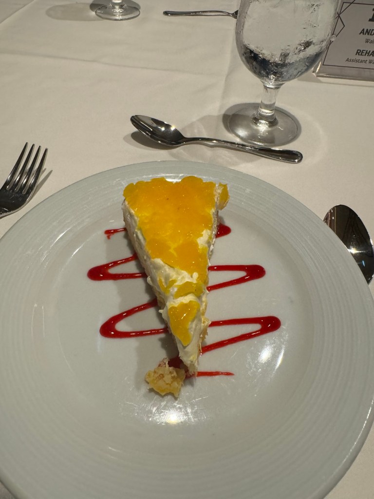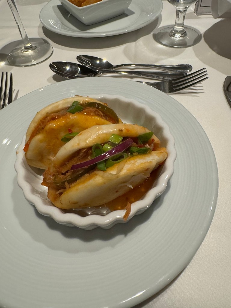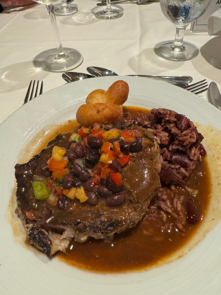 Dinner that night was A Taste of the Caribbean, which was a new menu for us. We both had the crispy coconut shrimp with pineapple celeriac slaw and sweet chilli sauce. I also had a second starter, the Asian bao taco, which consisted of roasted pork belly in a sweet-chili sauce topped with sautéed vegetables and pork crackling in a soft, steamed bun. For his main course, Graham had the garlic-herb buttered tiger shrimp served with jasmine rice, sautéed seasonal vegetables and a garlicky herb butter. I had the jerk seasoned pork chop with rice and beans, and Jamaican fried dumplings. For dessert, we both had the pineapple sunshine cake. Dinner was very tasty. We had our usual Chateau St. Michelle Riesling with dinner.