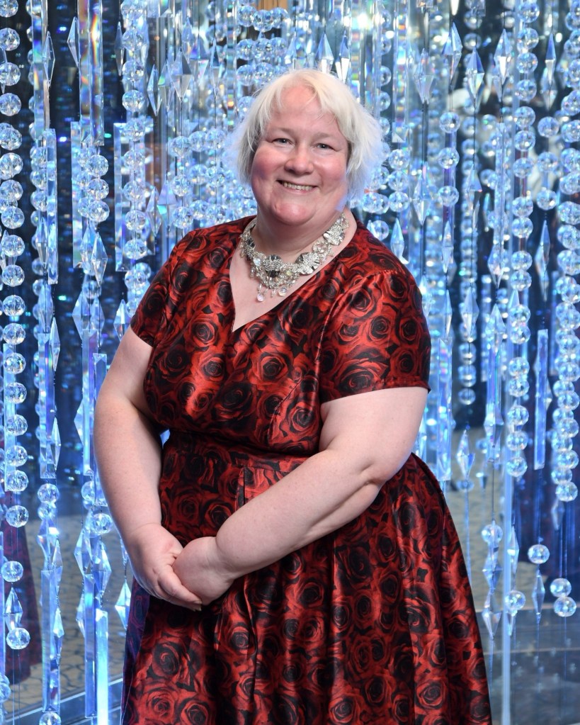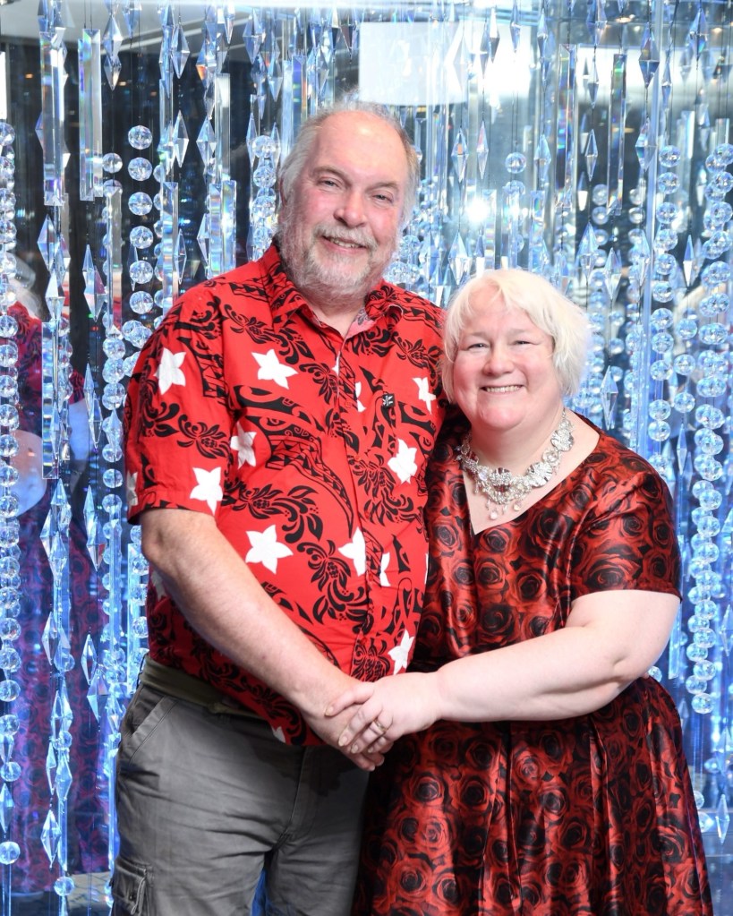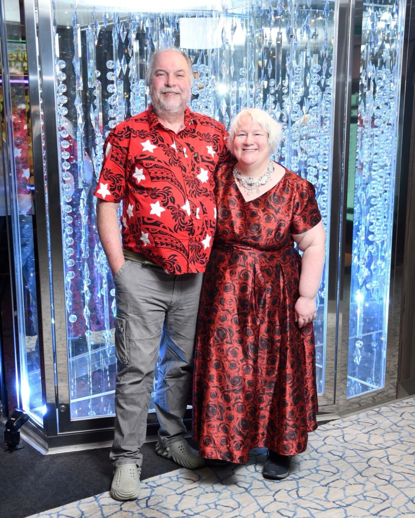 We headed back down to the Music Hall for trivia @ 5. This was a complete disaster, and we only scored 2 out of 15. The winning score was 9. After this we went to the cabin to get showered and changed. It was red night that evening. Red is not a colour I wear often, but at the last minute I had decided to switch out one of the heavy gowns with a lightweight gown that is black with red roses. I wore that. We went downstairs to get some photos.