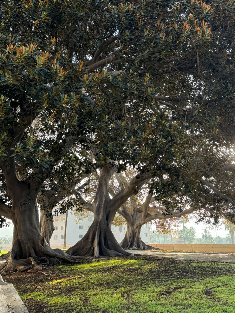 Shortly after we had finished our breakfast, the announcement came that the ship had been cleared. We headed out. We stopped for the port photos and then we decided to go exploring. As soon as we came through the port gates, we spotted the meeting point for our tour. We had about 90 minutes to explore. We made a tactical error. We thought we may as well have a quick look at the old town. We misidentified the beautiful building that was right across the road and headed straight on rather than left. This actually turned out to be a blessing. Instead of in the old town, we initially ended up in a small park with some very interesting and beautiful trees. They were Moreton Bay Figs.