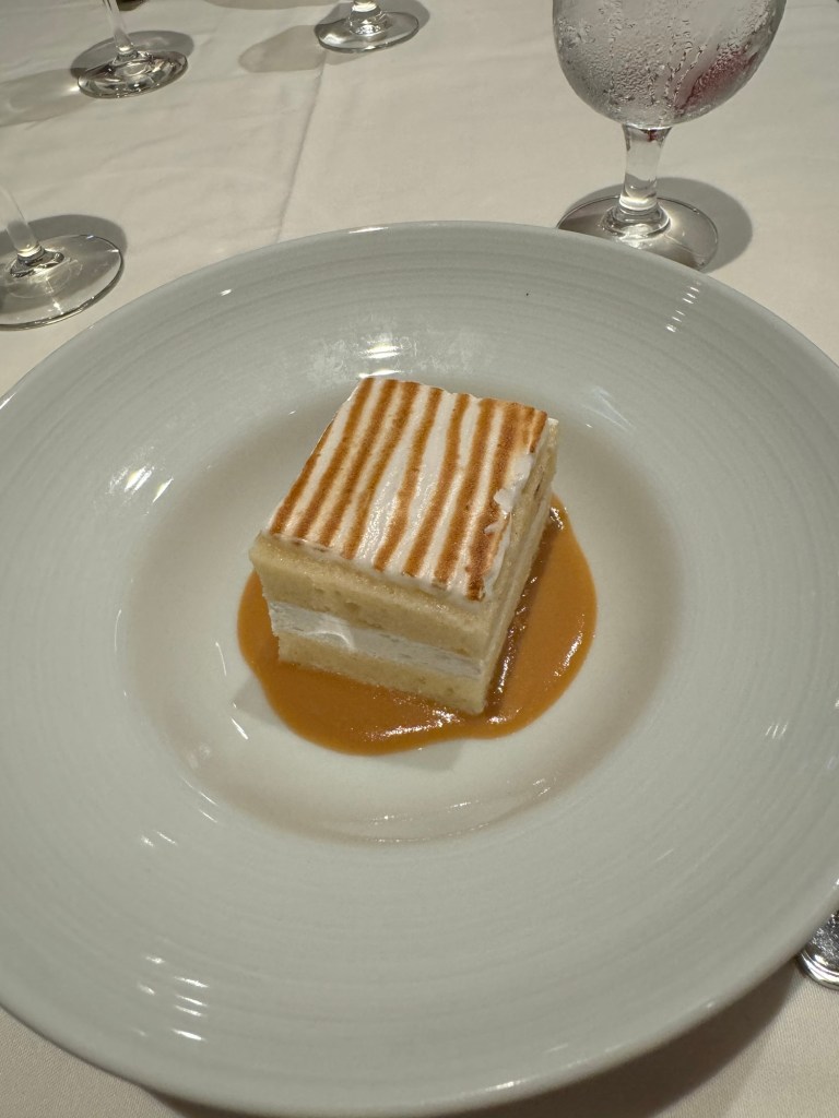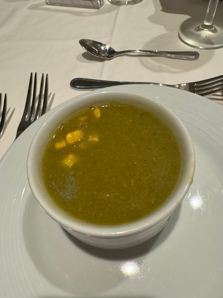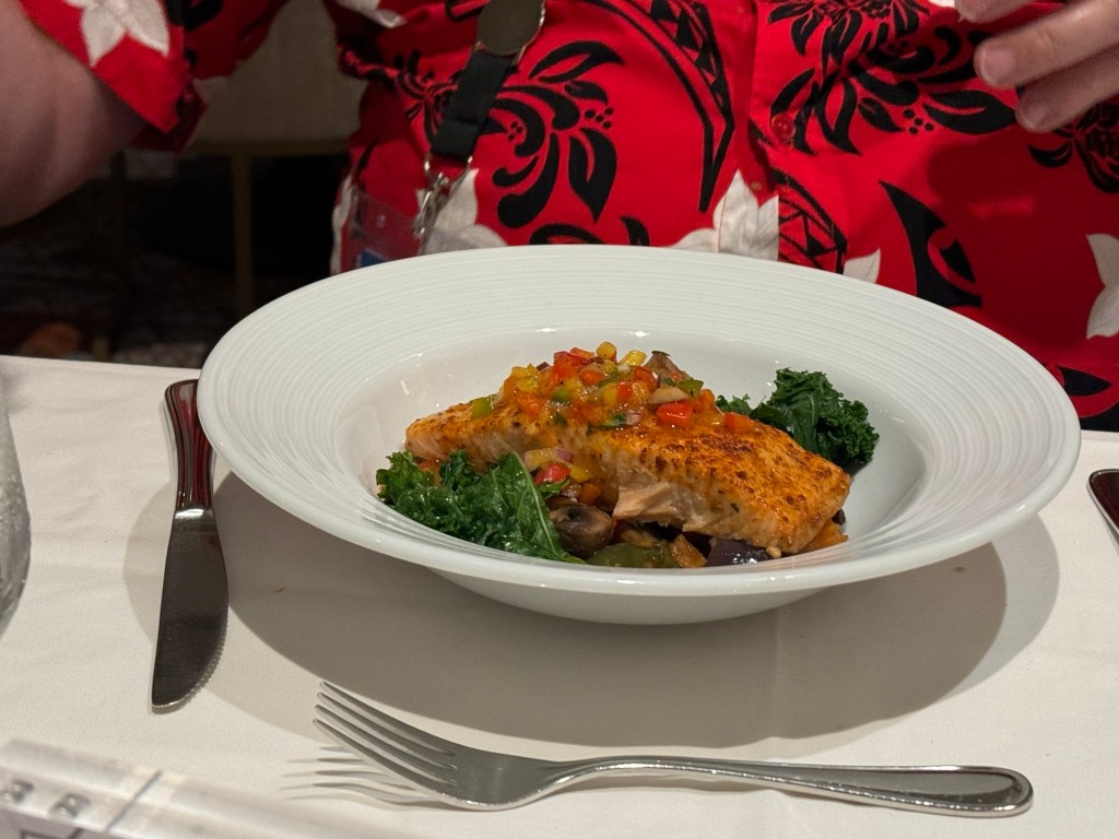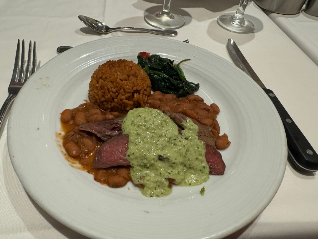 The menu that night was A Taste of Mexico. We both had the poblano pepper soup topped with roasted corn, red peppers, fresh cilantro and sautéed chorizo for our starter. For his main course, Graham had the chili-lime crusted salmon served over a sweet potato, mushroom and kale hash topped with mango and bell pepper salsa. I had the carne assada, which was chili-marinated and grilled flank steak with Mexican-style rice, pinto beans, sautéed spinach and peppers, and salsa verde. I gave the spinach to Graham. We both had tres leches cake for dessert. We also had a couple of glasses of Chateau St. Michelle Riesling each.