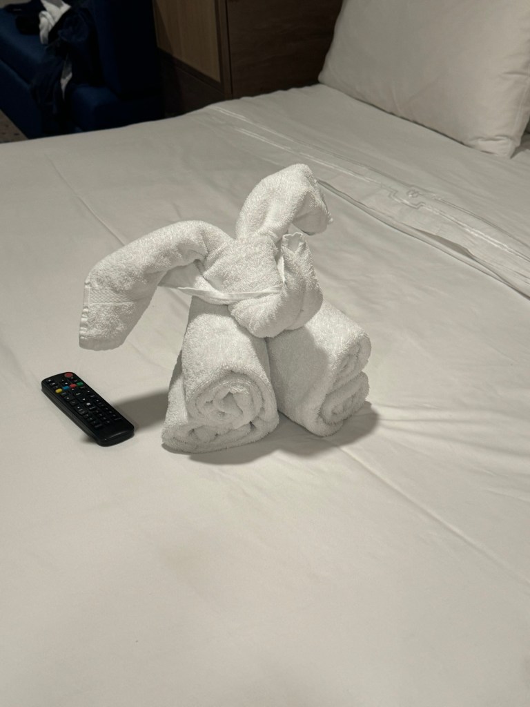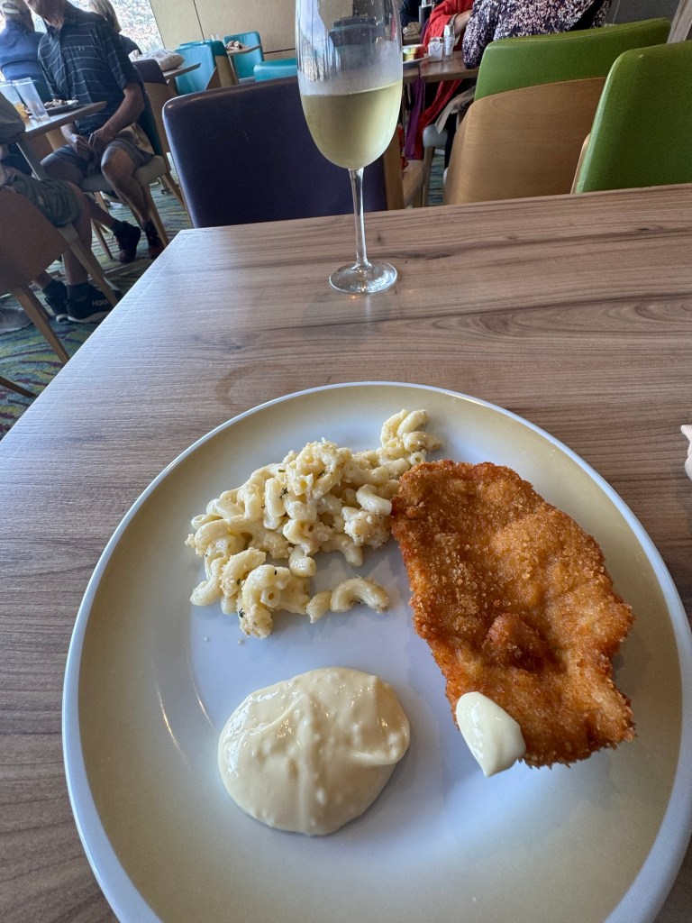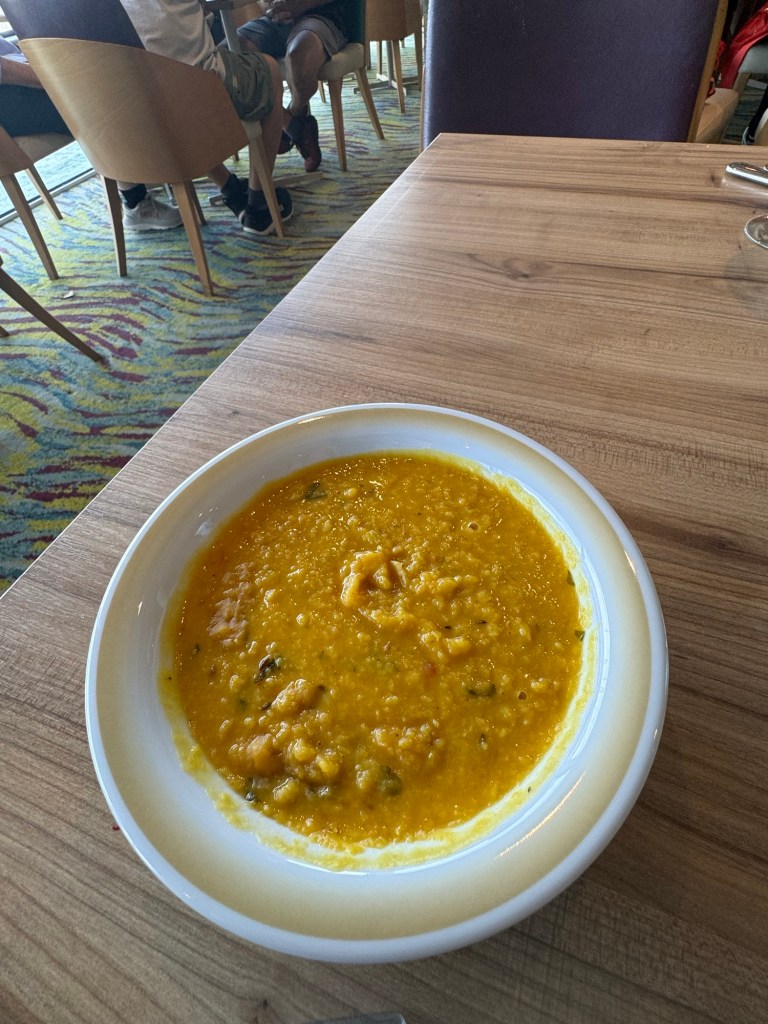 Once we were back on the ship, we quickly went to our cabin to drop off our stuff. We found another cabin mate. I took a quick photo and then we went up to the Windjammer for some lunch. Graham had a glass of chardonnay with his lunch. He had a DIY salad followed by some fusilli carbonara. He had some white chocolate chip cookies for his dessert. I had a pork schnitzel with garlic aioli and macaroni cheese. I had a look at the desserts, but there was nothing that grabbed me. Instead, I got a bowl of lentil dal, which was delicious. I had enough alcohol for the time being and had some fruit punch with lunch.