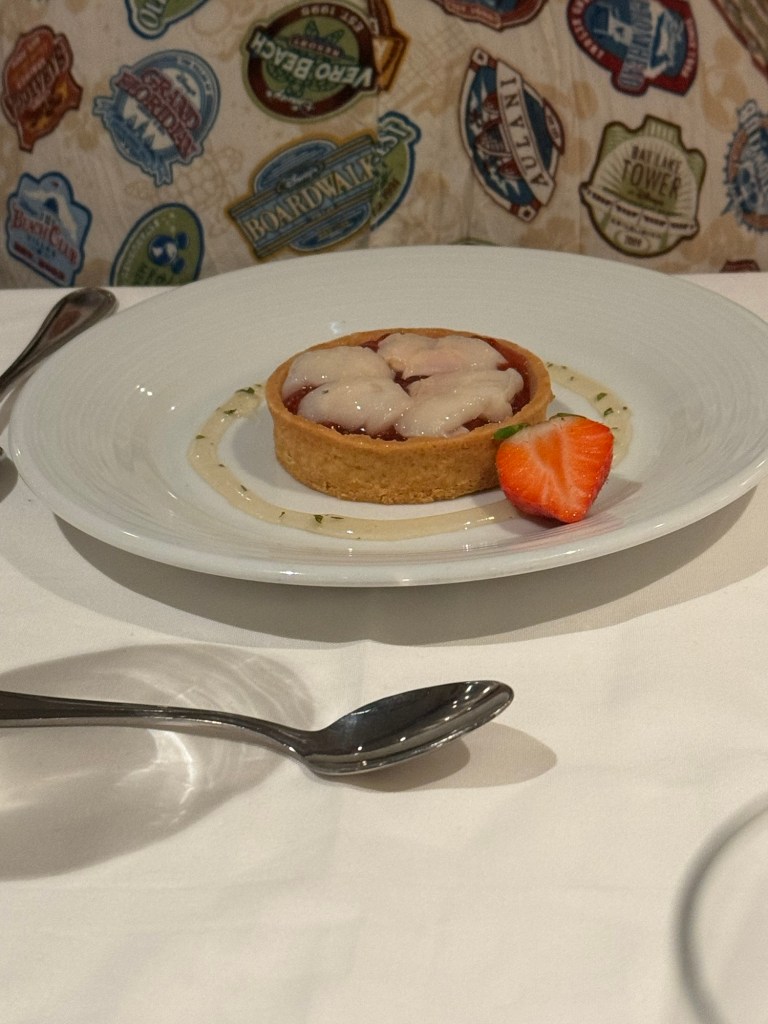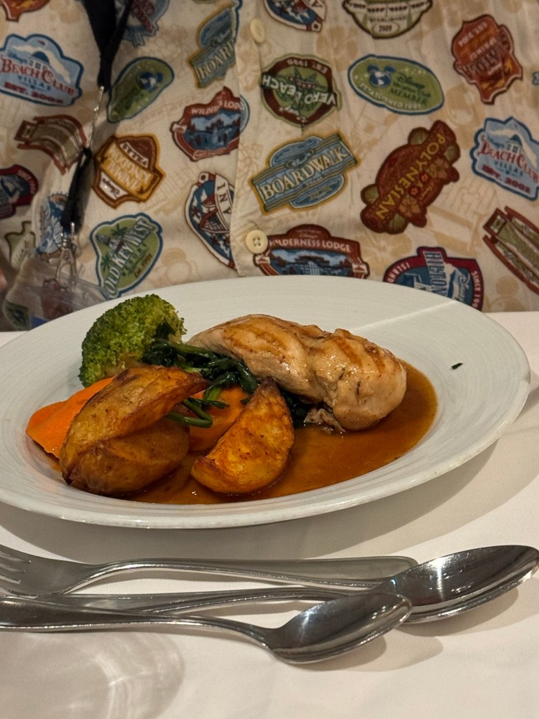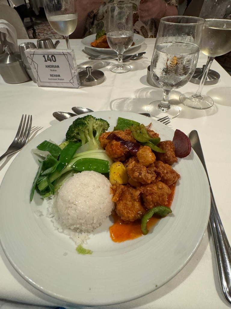 Graham started with the salmon gravlax , which consisted of cured Atlantic salmon with thinly sliced cucumber, onion and tomatoes, lemon, capers, and a honey-mustard dressing. I started with the Chicken and cabbage dumplings with a soy and sesame dipping sauce, which is one dish on this menu that I really enjoy. For his main course, Graham had grilled chicken breast with roasted potatoes, carrots, spinach, and a savoury thyme jus. I decided to give the sweet & Sour Pork another chance. This is described as Cantonese style sweet and sour pork with golden pineapple, red peppers, and Jasmine rice. I really don’t understand what they are doing with their sweet and sour pork. Cantonese style sweet and sour pork contains pork that is battered and fried so that it is crispy. Well, their sweet and sour pork always seems to be soggy. I have had this dish in food courts where things are kept warm for extended periods of time and yet the pork or chicken was still crispy. I was willing to give them the benefit of the doubt and tried again, but it tasted the same as it had on the Alaska cruise. I won’t be having this on any future cruises. For his dessert, Graham had the vegan lychee tart with fresh strawberries. I had the mango tapioca pearls with a five-spice mango compote. I had decided to be adventurous on our second Alaska cruise that year and give this a try. This was a surprise success, and it actually turned out to be one of my favourite desserts across all the menus. I had looked forward to having this again and it did not disappoint on this occasion either. We had our usual Chateau St. Michelle Riesling with dinner.