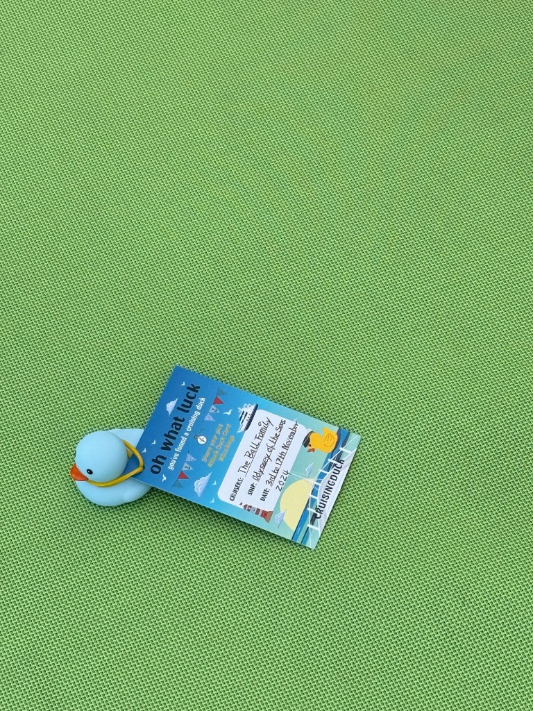 I headed back to the cabin to drop off my precious and to add the tags to some more ducks. I then went to hide the ducks and then I went to find Graham. He was sitting on a sofa near the Seaplex. While I was otherwise occupied, he had been challenged to a game of chess. There was an outdoor chess set near the Seaplex. The teenager who had challenged him had underestimated Graham and apparently had stomped off without even saying thank you when he lost. Graham was very amused by the whole thing.