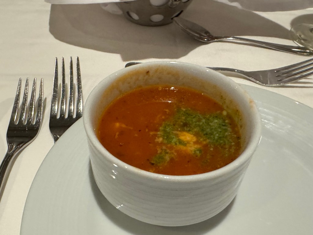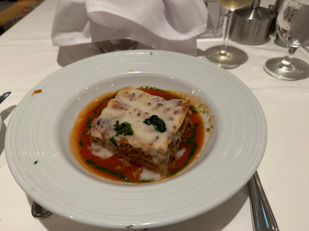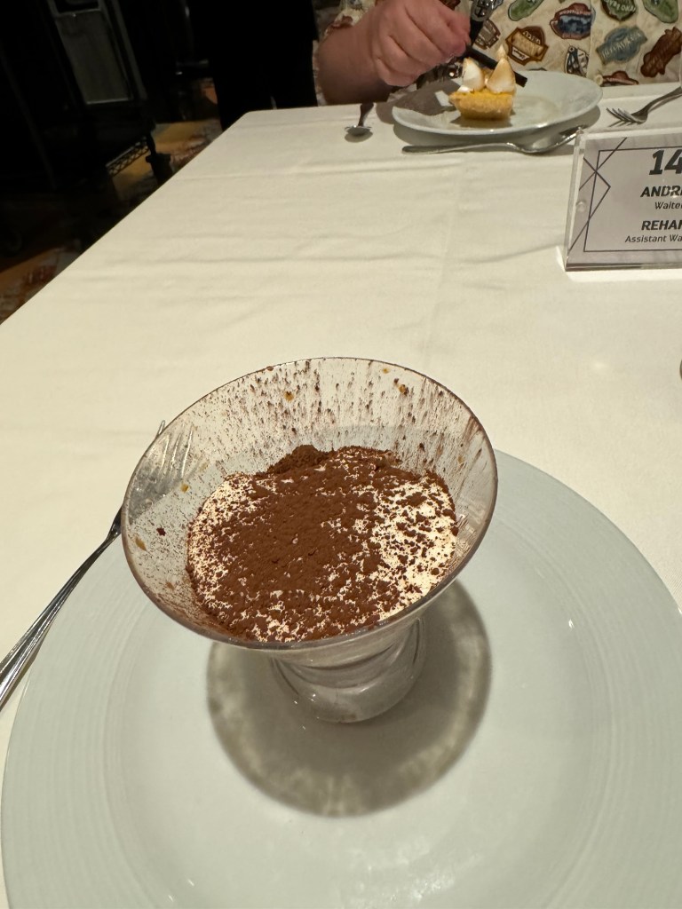 Dinner than night was the A Taste of Italy menu. This is one of my favourite menus. However, I tend to make the same choices every time. This time round, I decided to mix things up. I started with the Minestrone. Graham passed on a starter. For our main course, we both had the lasagne, which was delicious. For his dessert, Graham had the lemon curd tartlet, and I had the Tiramisu. We both enjoyed our desserts. We had decided to mix up our wine selection and had a glass of Moscato each. I normally really like the Moscato on Odyssey, but this was not as good as they one we had on the Holy Land cruise in 2022 or as the one at Giovanni’s Kitchen.