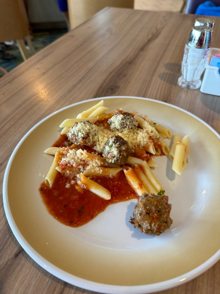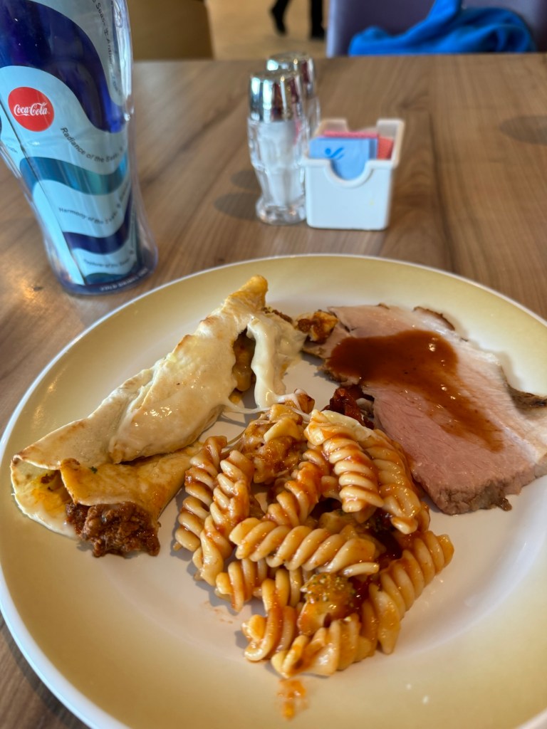 I was ready for some lunch. Graham was not hungry but came along to the Windjammer with me. I had a slice of Jerk roasted pork, a Beef enchilada and some fusilli with sausage and vegetables. What I really fancied was penne with meatballs and tomato sauce. However, this had all gone when I went to get my food. When I went to check on what the desserts were that day, I noticed that it had been replenished and I decided to get some of this instead of dessert. Graham had spotted some rice pudding on his way to our table, and he could not resist this. He had a bowl of this.