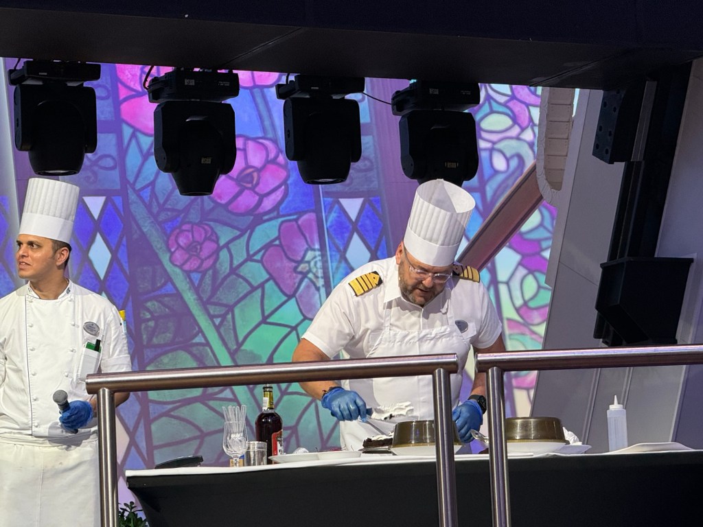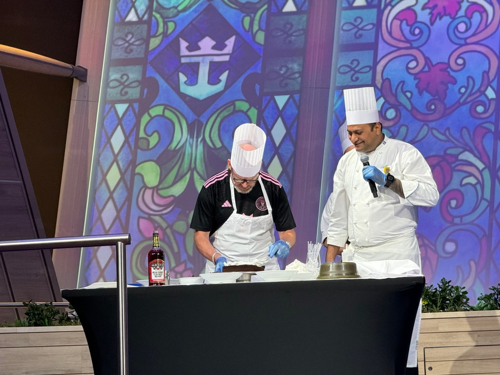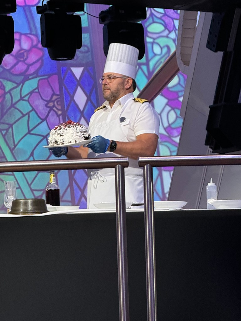 I made sure I got to the Two70 nice and early as I had rightly assumed that this would be a busy event. I got a decent seat and just settled down to read. The activity was a cake decorating contest between the Captain and Cruise Director. Captain Per is a real character, and this promised to be hilarious. It did not disappoint either. It turned out completely different from what I expected. I had experienced something similar to this on one of our long Disney cruises and there it was a genuine contest where the Captain and the Cruise Director got creative. With this, both of them were paired up with chef who guided them through how to assemble the cake. This was heavy on the comedy and light on the actual decorating. Towards the end, it turned into a food fight. I nearly laughed tears. As we left the Two70, they had a large version of what the cakes should have looked like and were giving out pieces of this. I passed on this as I was still full from lunch.