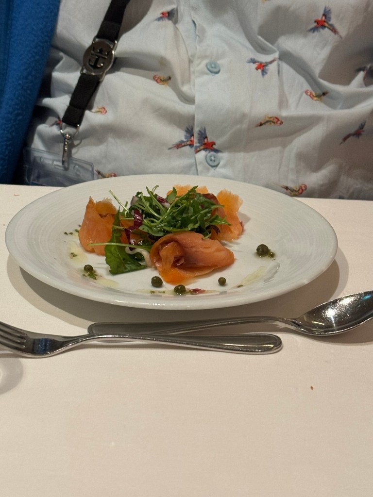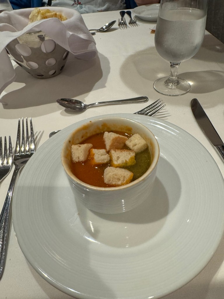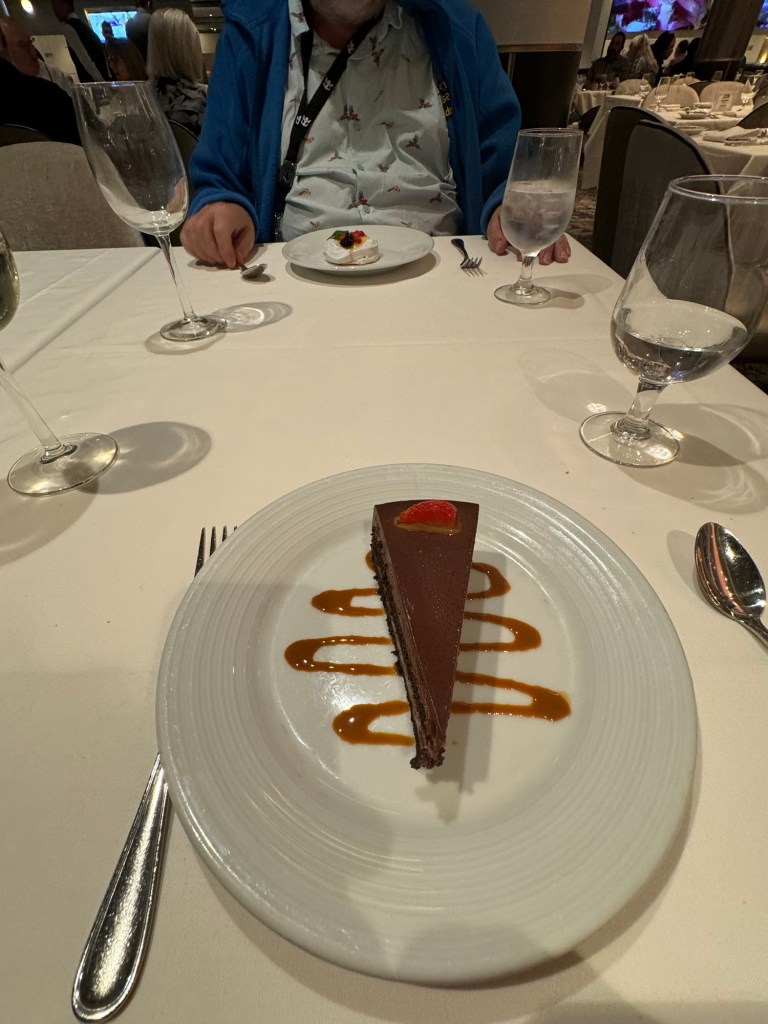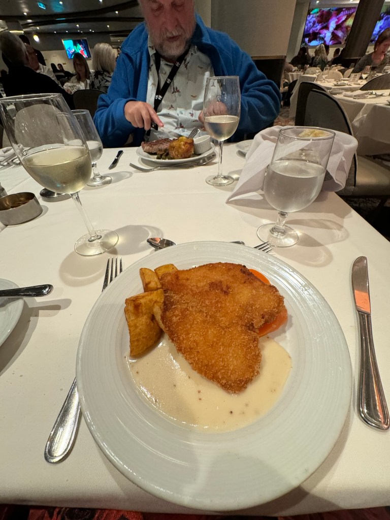 Once we had made the rounds of the photo opportunities, we went to the dining room for dinner. The menu that evening was another unique menu for longer sailings and was called A Taste of the World. Graham had smoked salmon carpaccio with red onions, capers, dill, parsley, and lemon dressing for his starter. I had roasted tomato soup topped with crème fraiche, garlic focaccia croutons and basil pesto. For his main course, Graham had the Steak Diane, which consisted of seasoned strip steak served with a baked potato, grilled vegetables, and a rich mushroom-Cognac sauce. I had chicken schnitzel served with sautéed potatoes, a Dijon mustard sauce, and classic cabbage slaw. I am not always too keen on coleslaw, but this was not really what I would call cabbage slaw, but a proper German cabbage salad that consisted of finely cut cabbage with an oil and vinegar dressing and was flavoured with caraway seats. I happily would have made a meal out of this. This also worked very well with the Chateau St. Michelle Riesling. For dessert, Graham has the summer fruit pavlova, and I had the Royal chocolate cake.