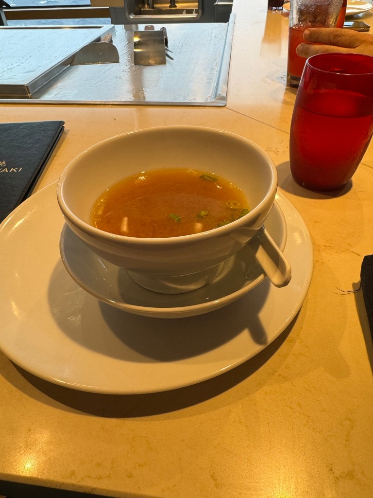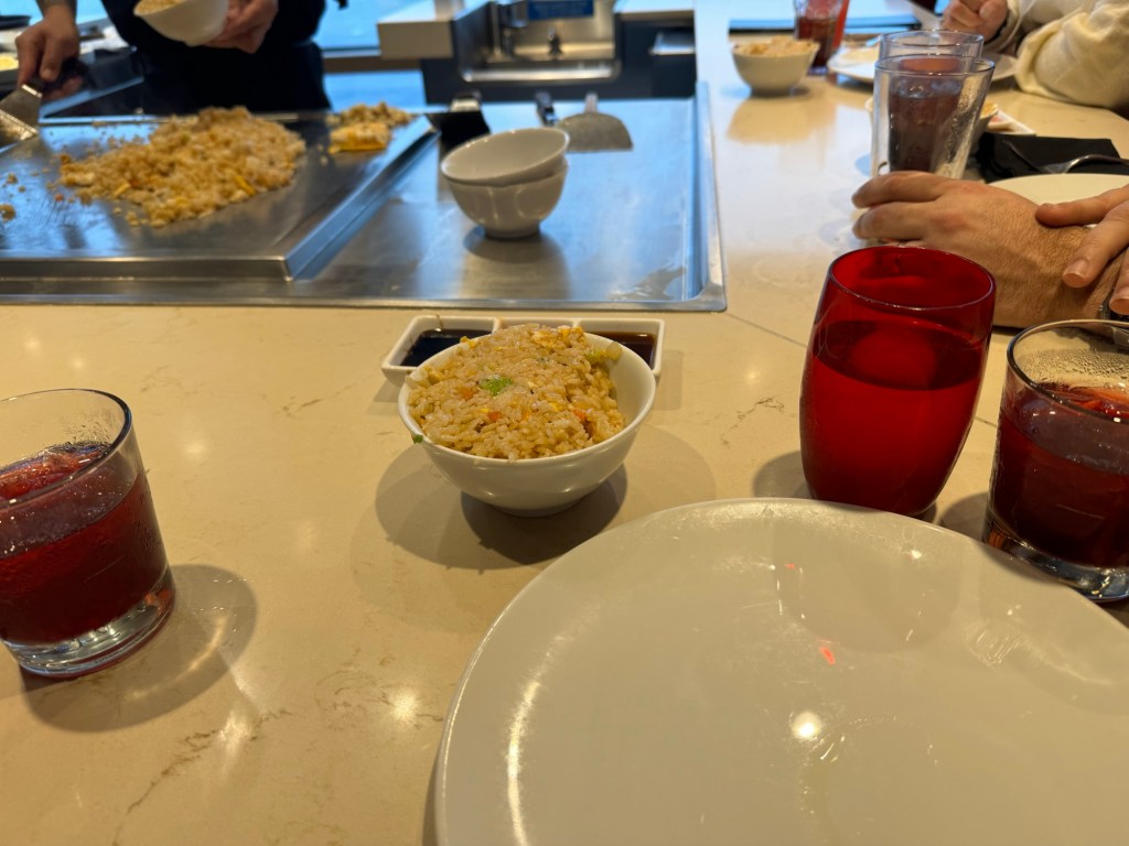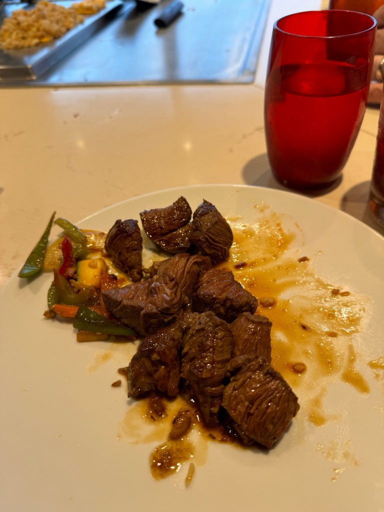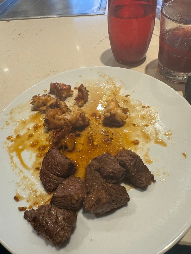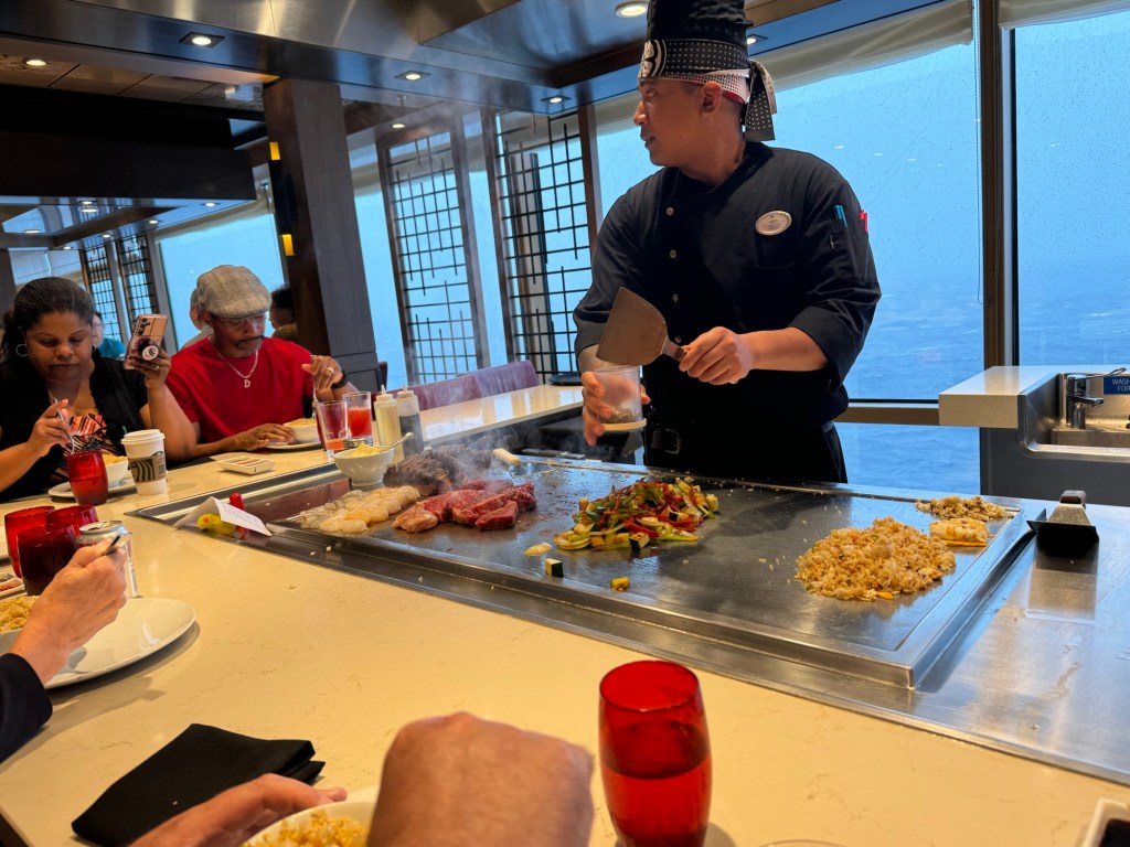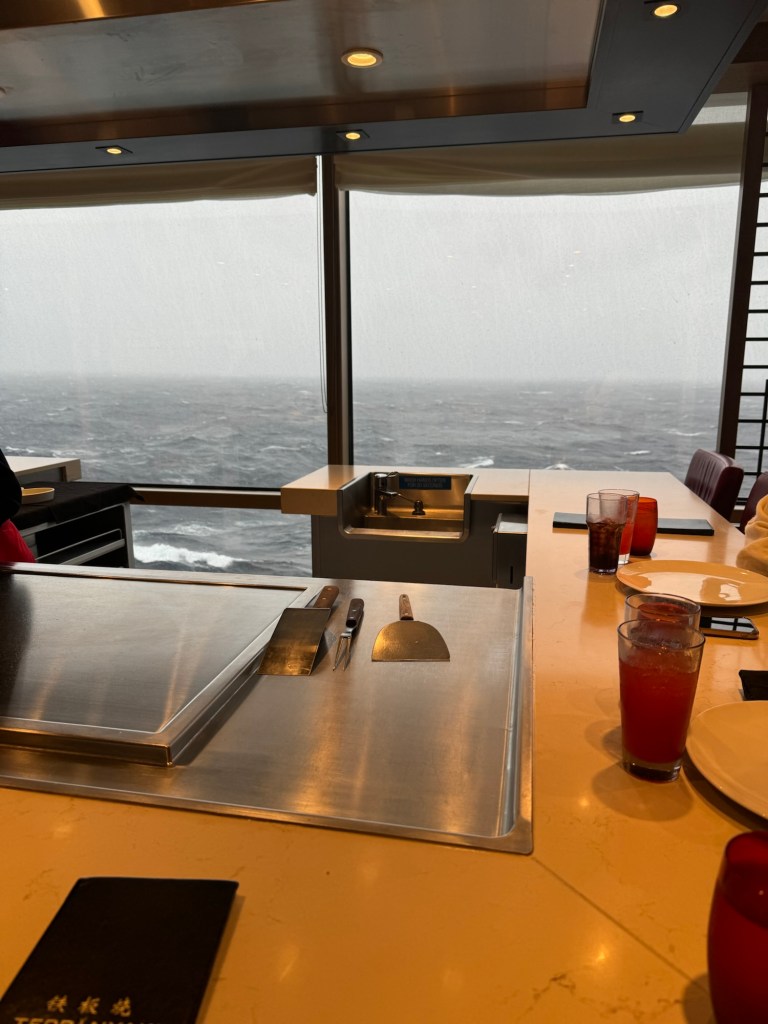 Lunch was a bit more thrilling than I had anticipated. Shortly after they took our orders and brought us water, the ship suddenly rolled, and everything went flying. There were some broken glasses. Things were cleared up quickly and fortunately things settled down after this. We got a scaled down version of the show. That was fine by me. Neither of us is keen on the show that comes with teppanyaki, but we like the food. The food was definitely top notch, and I very much enjoyed my birthday lunch.