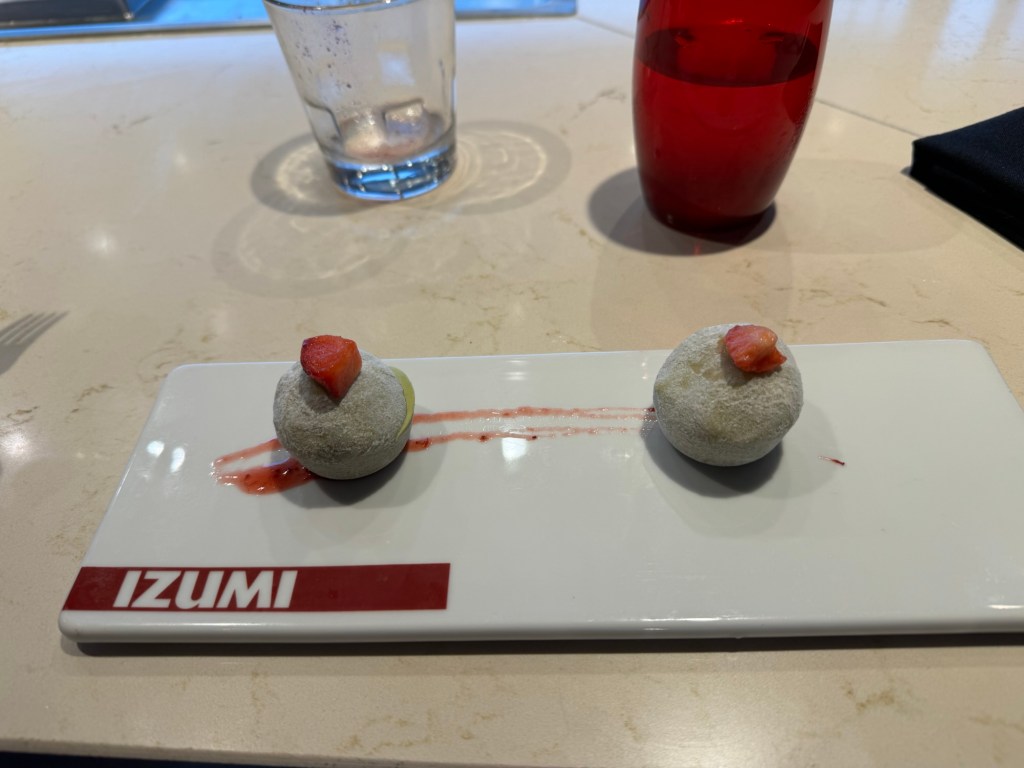 I had chosen the teppanyaki for my birthday lunch. They offer this for lunch on sea days, which is about half the price of dinner, but offers exactly the same food. According to the menu, you can choose between one protein, or some preset two protein combos. However, on Odyssey, they let you mix and match any two proteins. Graham passed on the starter. He had the vegetable fried rice, stir fried vegetables, New York strip steak and tiger shrimp. I had the miso soup for my starter. I then had vegetable fried rice, stir fried vegetables, beef tenderloin and lobster. We had a She’s A Geisha cocktail with lunch, which consists of fresh berries and pomegranate shaken with rose syrup and junmai grade sake. We both had the green tea mochi for dessert.