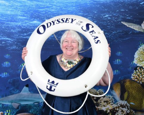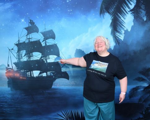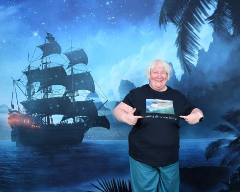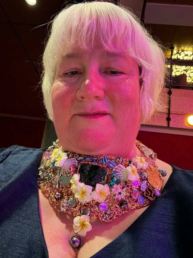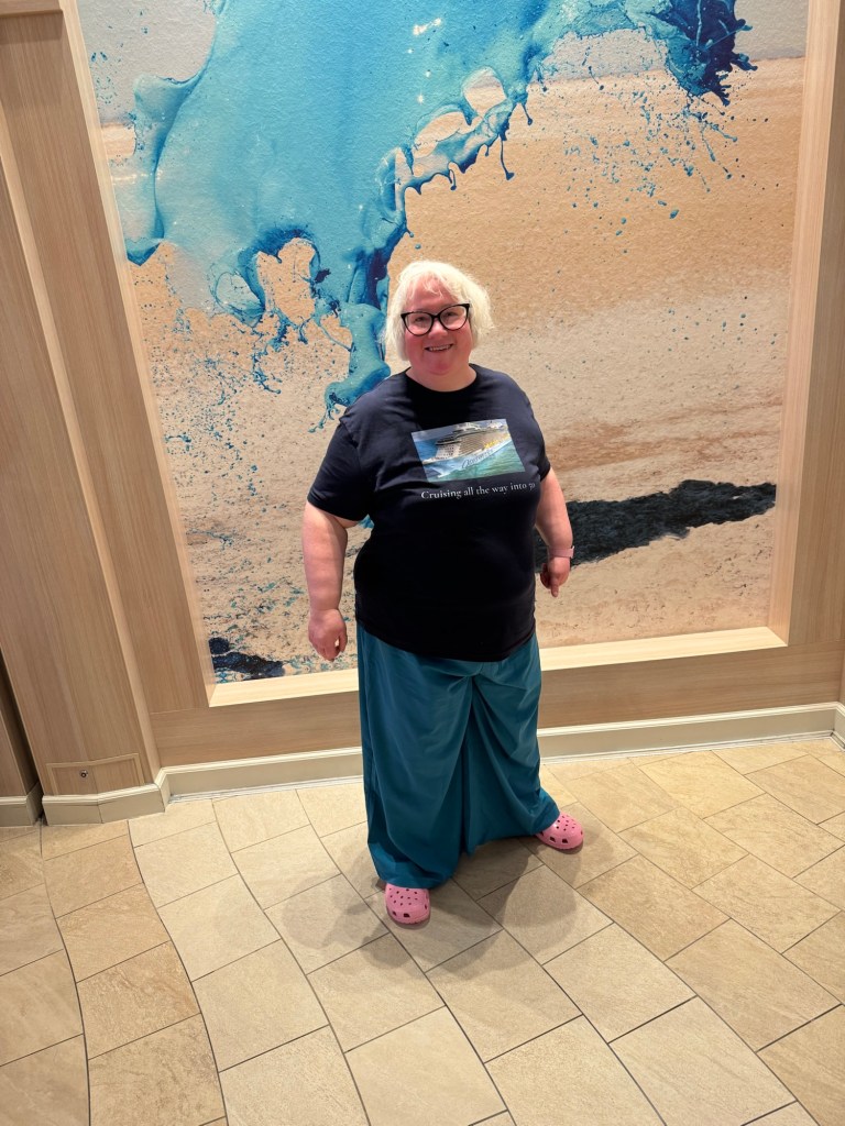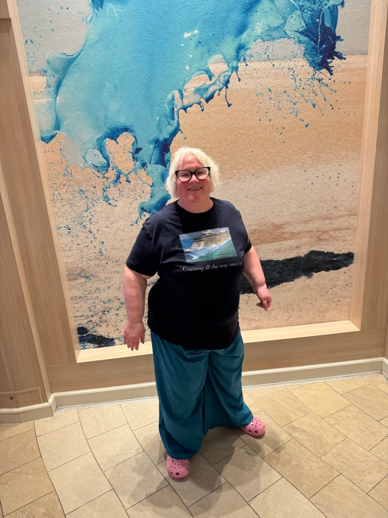 Once we had been released, we headed downstairs to the Music Hall for trivia @ 5. We did not do very well getting only 8 out of 20 with the winning score being 15. After trivia, I stopped by one the backdrops to get some photos with t shirt that my colleagues had made for me. We headed up to the Roy bar for a bit. We both had a Watermelon Rita. Once we had enjoyed our drinks, we headed back to the cabin to get changed. We found some carnage. The wine glasses had smashed. The wine bottle was on the floor, but thankfully undamaged. I picked up as much of the glass as I could. Once I was ready, I tried my hand at a selfie as I wanted to share a photo of my necklace on the Facebook group of the artist that created it.