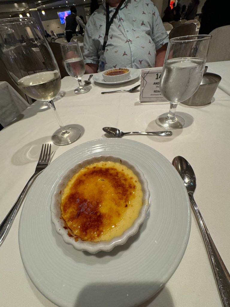The menu that evening was A Taste of the Mediterranean. Graham had the shrimp cocktail for his starter. I was not keen on the starters and passed. The rest of the menu however was a hit. For his main course, Graham had the prime rib with a baked potato, buttered seasonal vegetables and a horseradish au jus. I had the Chicken piccata, which was Panko crusted chicken in a white wine and caper butter emulsion, served over creamy lemony mashed potatoes and seasonal vegetables. I was not sure about the lemony mashed potato when I saw this on the menu, but the flavours worked really well together. We both had the pistachio crème brûlée for dessert. We both had a couple of glassed of the Chateau St. Michelle Riesling. I was very relieved that we made it through dinner without anybody coming to sing Happy Birthday.