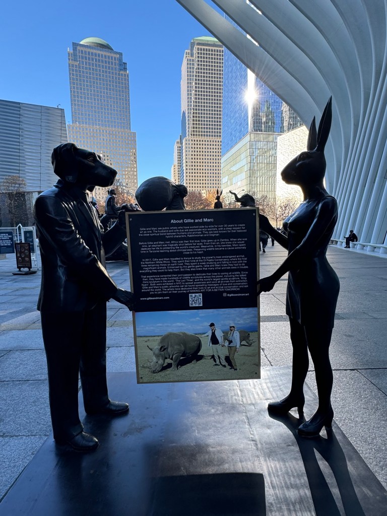 When I made some loose plans for New York before the trip, I had no intention of visiting the 9/11 Memorial again. We had done this in 2016, and I figured once would be enough. However, I had no clear idea just how close this is to the ferry terminal. As we were approaching the Manhattan ferry terminal, I spotted One World Trade Center right in front of us. We could have walked this in about fifteen minutes. However, I figured I would do plenty of walking that day. We took the subway for two stops, and this brought us out right opposite the Oculus shopping centre, which is part of the World Trade Center complex. We then walked towards the actual 9/11 Memorial. On the way we came across a series of animal statues that looked strangely familiar. Yet, I was sure that they had not been there in 2016. I was right on both counts. The series is called A Wild Life for Wildlife and was created by British and Australian artists, Gillie and Marc. The statues were installed in May 2023 and were meant to be on display for 12 months. The reason why they looked so familiar is that there is a statue with two of the characters near Circular Quay in Sydney. I have just found out that one of their statues is right here in Manchester. I think I need to check this out.