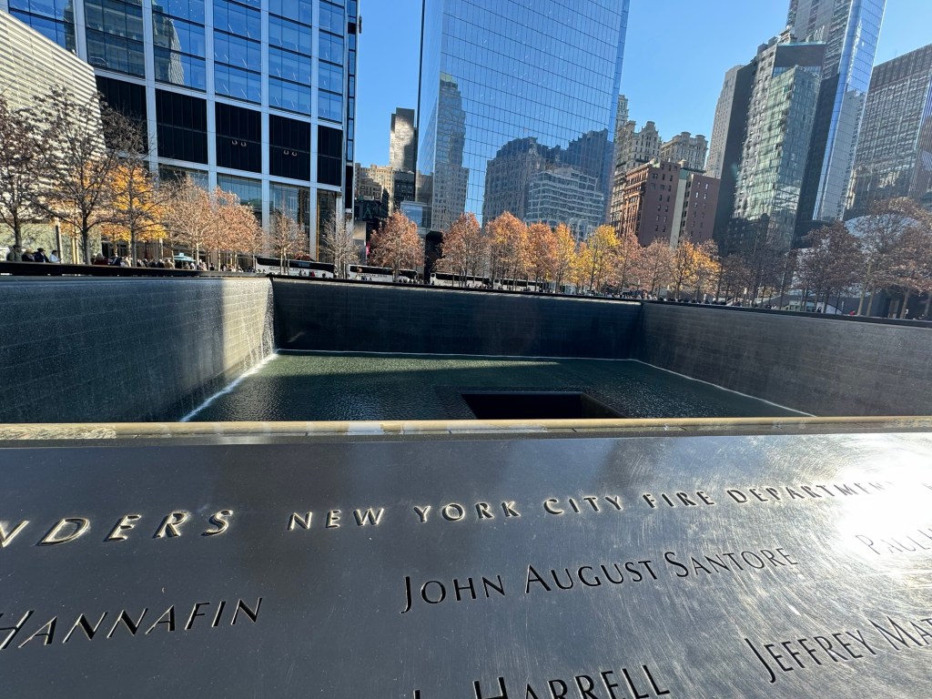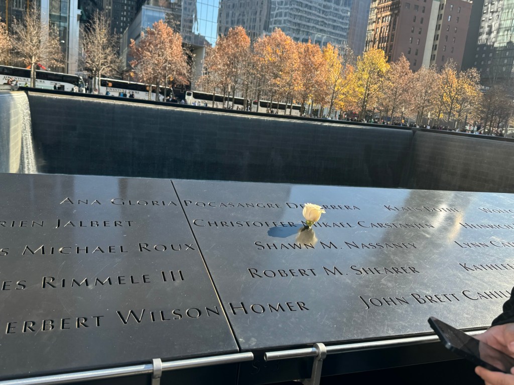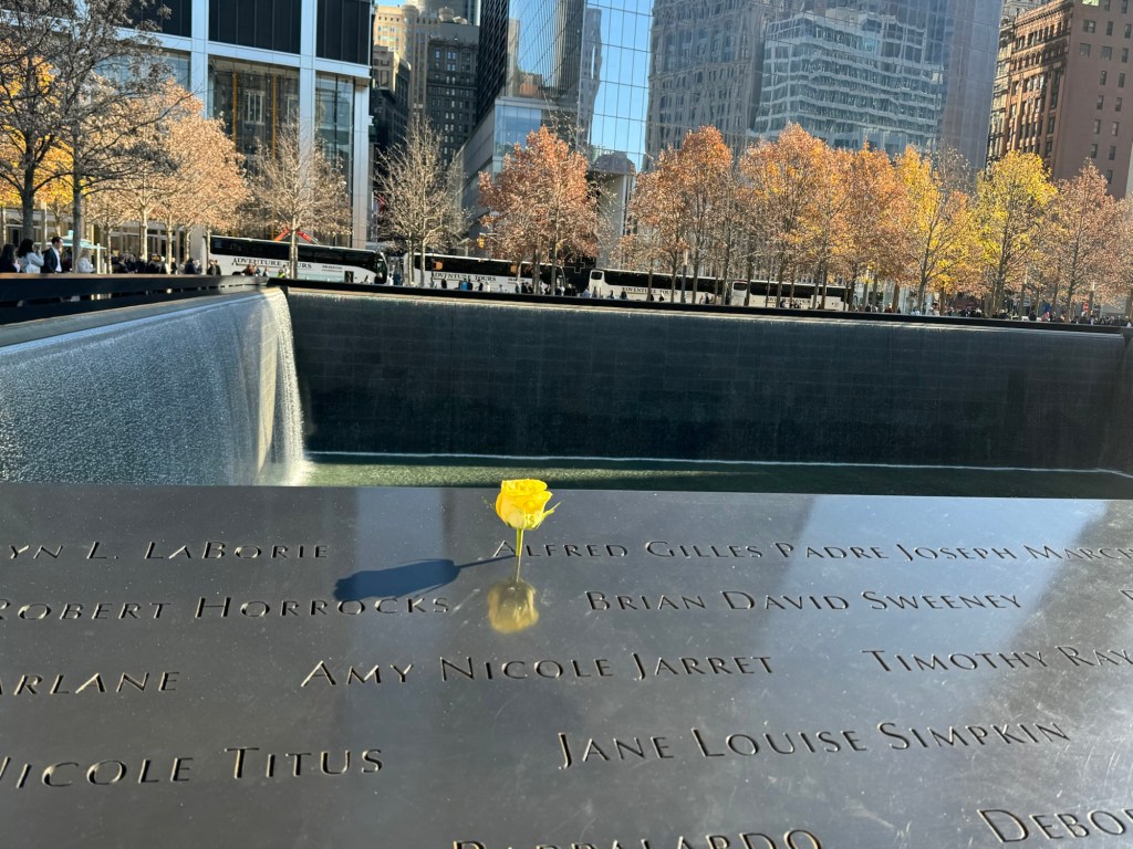 We pushed on towards the actual memorial. One of the pools is currently under maintenance. I thought this did not look quite like I remembered it. Then I saw a sign advising what was happening and that the other pool was still how it was intended. We headed over there. I was quite surprised to see some yellow roses. I remembered the white roses from our previous visit. They are put there by a group of volunteers on the birthday of the victims. Loved ones can request a photo of the birthday roses. The yellow roses were new to me. I checked if I could find anything out about them. Apparently, they were put there for Veterans Day for victims who had served in the armed forces. I found this very moving, too.