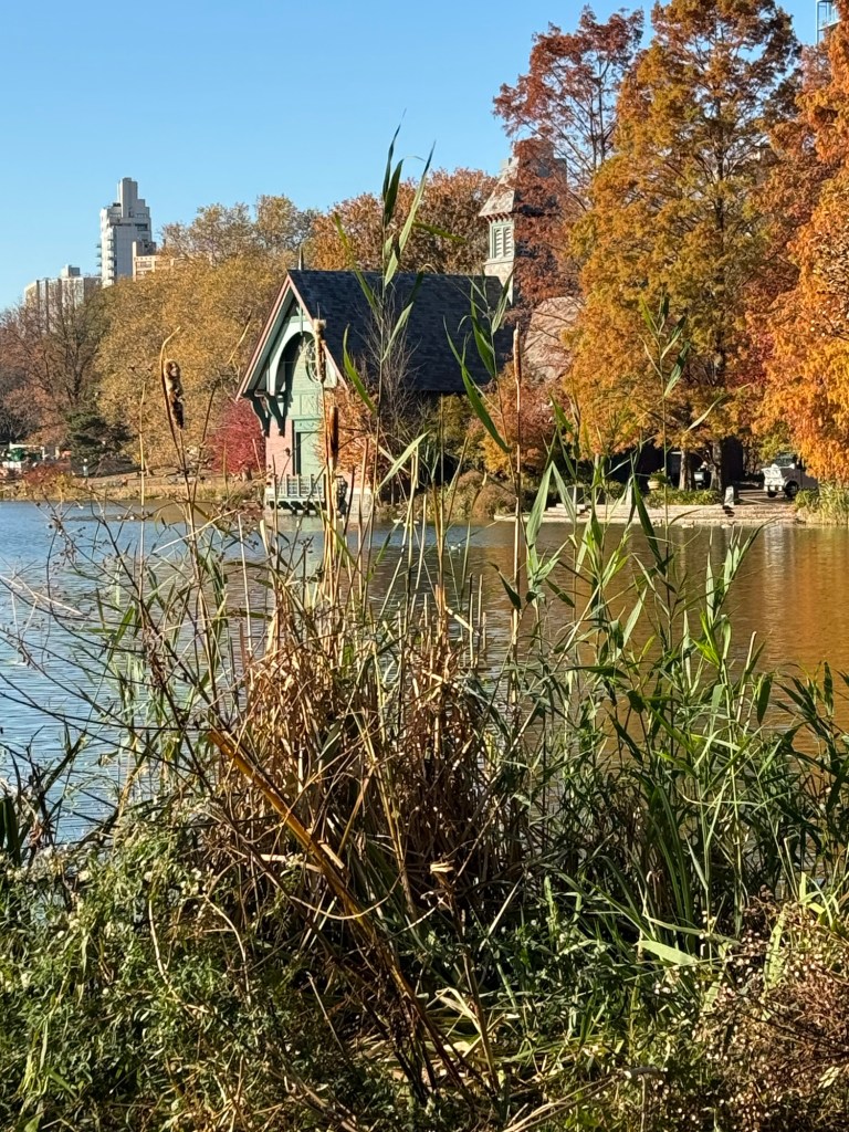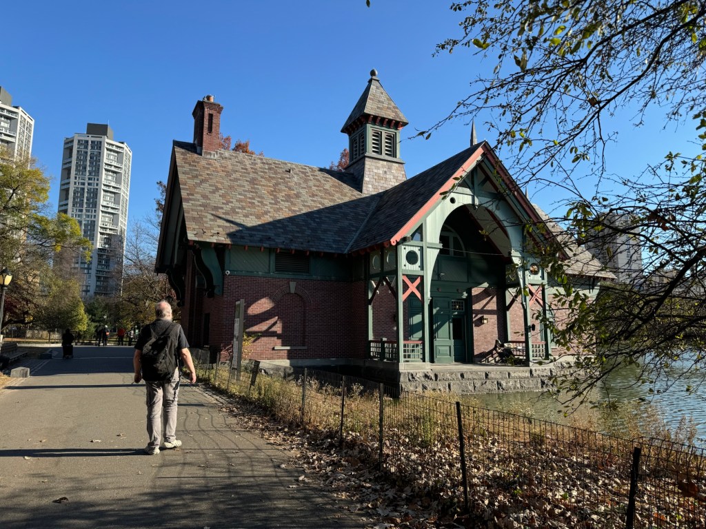 The conservatory garden was a dead end. There was a detour posted that took you south in Central Park via a fairly steep hill. As inevitably what goes up has to go down again, I did not really fancy this. Instead we exited onto 5th Avenue to avoid the stretch of construction. By then, I was ready for a snack. Before we visited New York in 2016, Graham had repeatedly told me that I needed to have a hot dog in Central Park. On the day, he told me that they are truly awful, and I never bothered. However, the only snacks near Central Park appeared to be hot dogs. I decided to take my chances. We ended up sharing a hot dog. It was nothing special, but it definitely was not awful, and it did fill a hole. We re-entered Central Park at the next entrance. Graham wanted to take a walk by the reservoir as he was hoping that there would be some interesting birds about. We were out of luck. The only birds were some ducks and Canada geese. It was still a nice walk though.