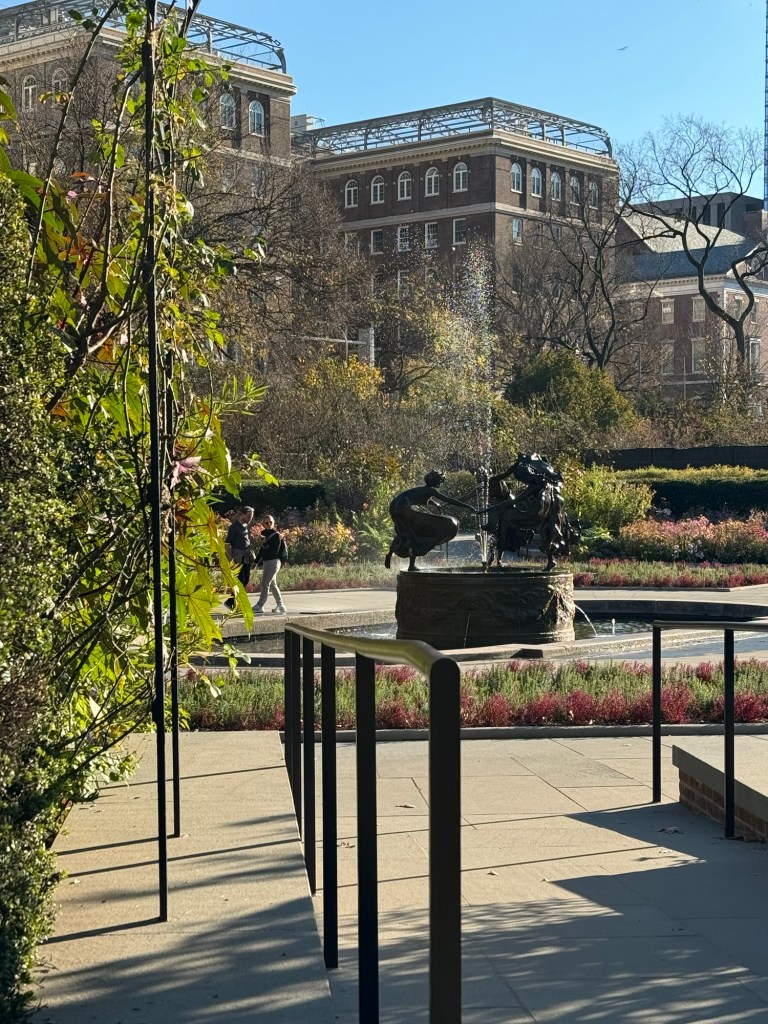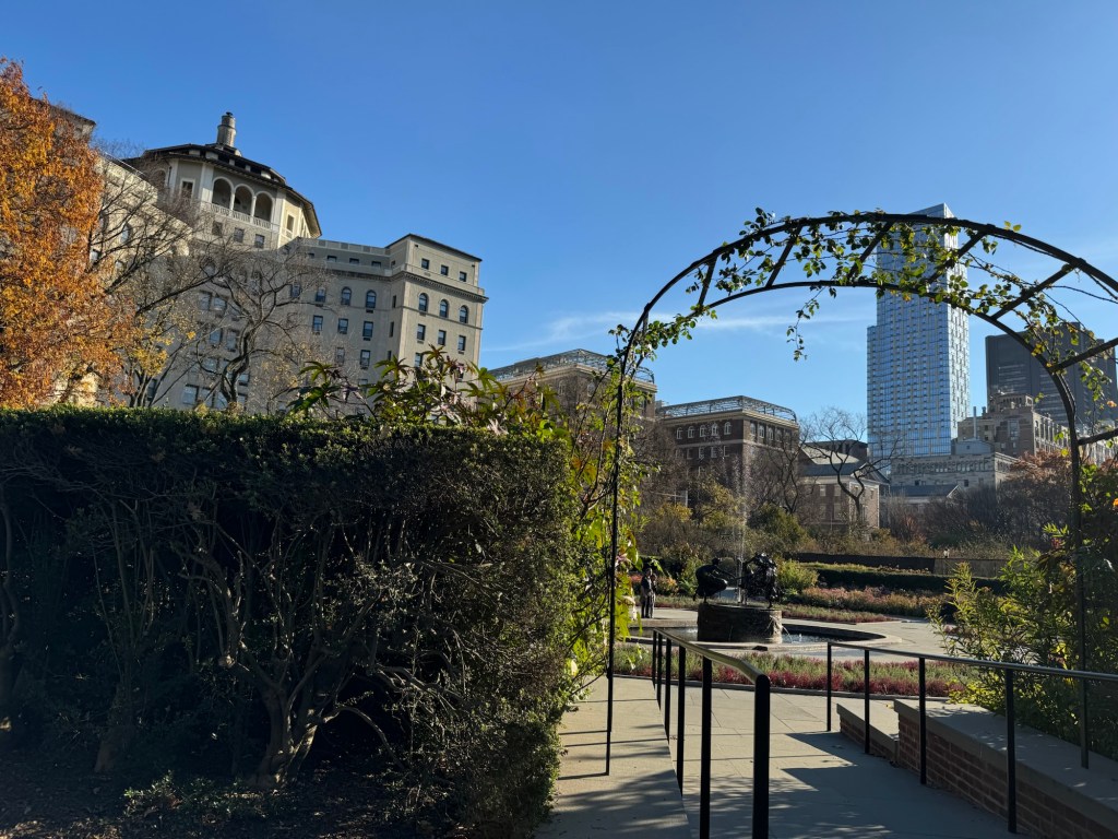 Near the north end of Central Park, there was a lot of construction going on. This led to a bit of an unexpected treat. In the middle of the construction zone was the Conservatory Garden, which is the only formal garden in Central Park. There was a small sign stating that the Conservatory Garden was open as usual. We decided to check it out. Every now and again, somebody passed through, but for the main part we had the place to ourselves. There were all kinds of birds around and I saw my first chipmunks in the wild. The real treat how was on an adjacent building. An osprey had made this its hunting base. This is not the kind of bird you would expect in the middle of a city. I suppose there are plenty of bodies of water in Central Park nor is there a shortage of rodents and small mammals. It was fascinating to watch this majestic bird go about its business.