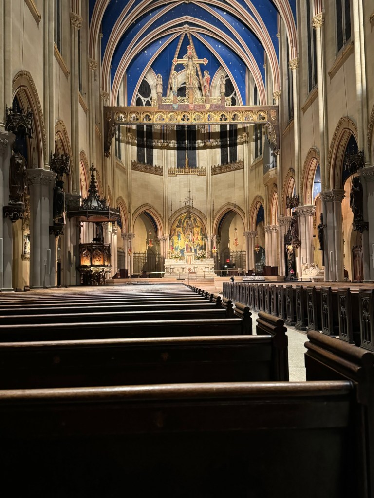 On our way to Times Square, we found another beautiful church. This church is called Church of St. Mary the Virgin. It is colloquially known as “Smoky Mary’s” because of the amount of incense used in the services. The church has been called one of the finest Gothic-inspired designs of New York’s late 19th century. It was designated a New York City landmark in 1989 and added to the National Register of Historic Places in 1990. This is another Episcopal church. If I had not seen the code of arms of the Episcopal church on the outside and seen it mentioned on an information display near the entrance. I would never have guessed this. Unlike the church we visited earlier, this was very ornate and had the look and feel of a Roman Catholic church. I am pretty sure that even though the churches technically belong to the same denomination, they are about as far apart as they come. I suppose this should not surprise me. The Episcopal Church of the United States is part of the Anglican Communion and in the Church of England we have a similar thing with high church and low church with the high church being closer to the Roman Catholic Church and the low church going more in the direction of Lutheran or reformed churches. Although I am definitely leaning towards the latter in my personal preference, this was a stunning church, and I am glad that we had found it.