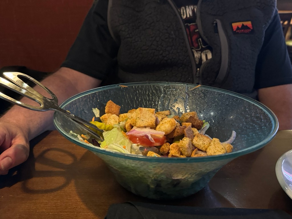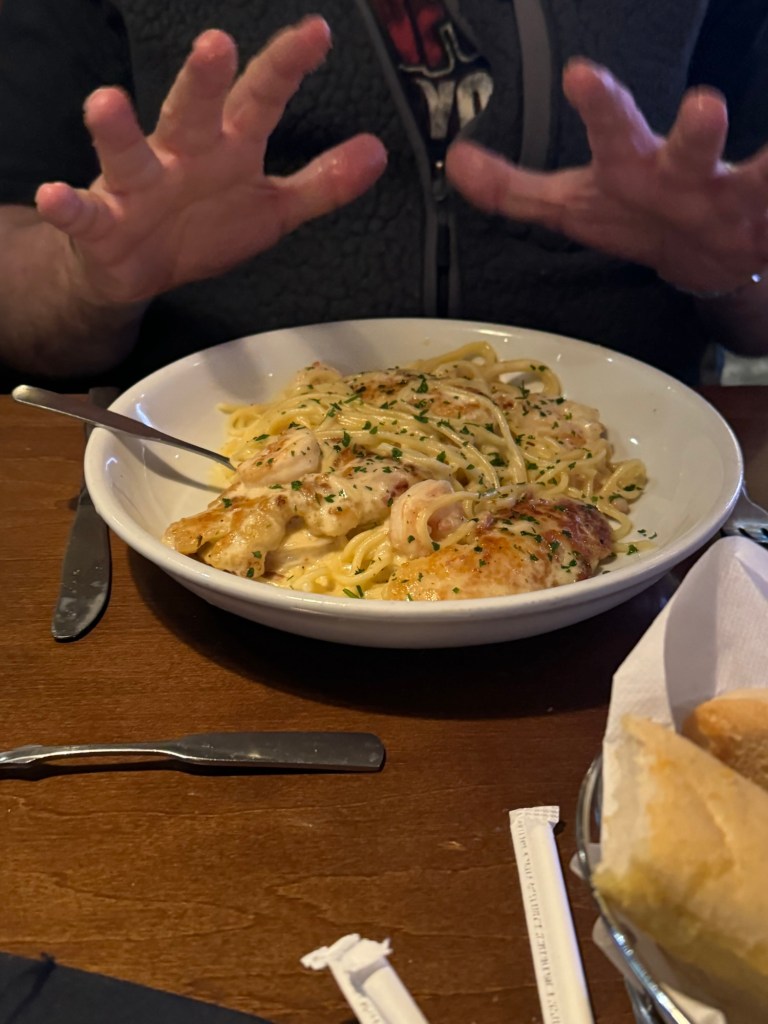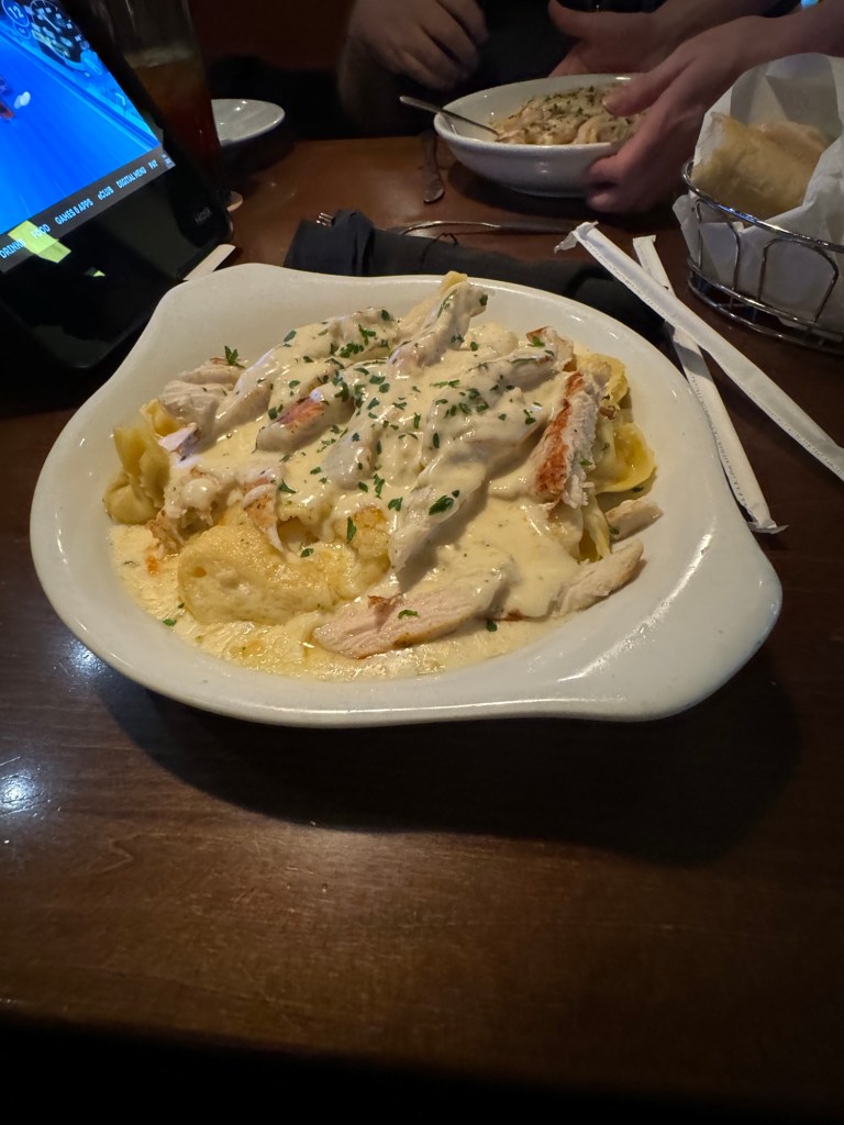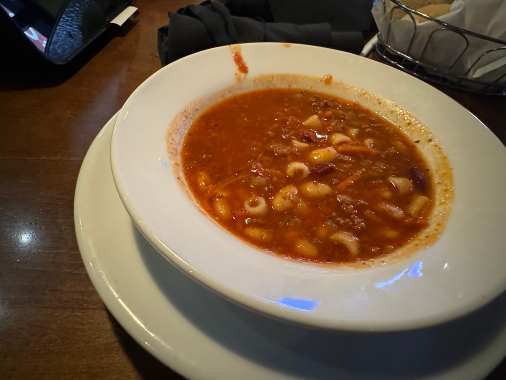 Dinner that evening was at The Olive Garden. I was surprised that there was one right at Times Square. This was too good to pass up. Graham had a house salad followed by a chicken and shrimp carbonara. He had a mango strawberry iced tea. I am more of a soup than a salad person and had the pasta e fagiole soup. I resisted the offer of a refill. I had the chicken tortellini Alfredo, which was very rich and delicious. Even with declining a second helping of the soup, I did not manage to finish it. I had a Bellini peach and raspberry iced tea. I made good use of the free refills for this.