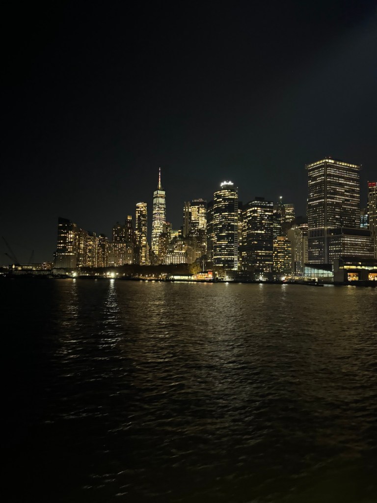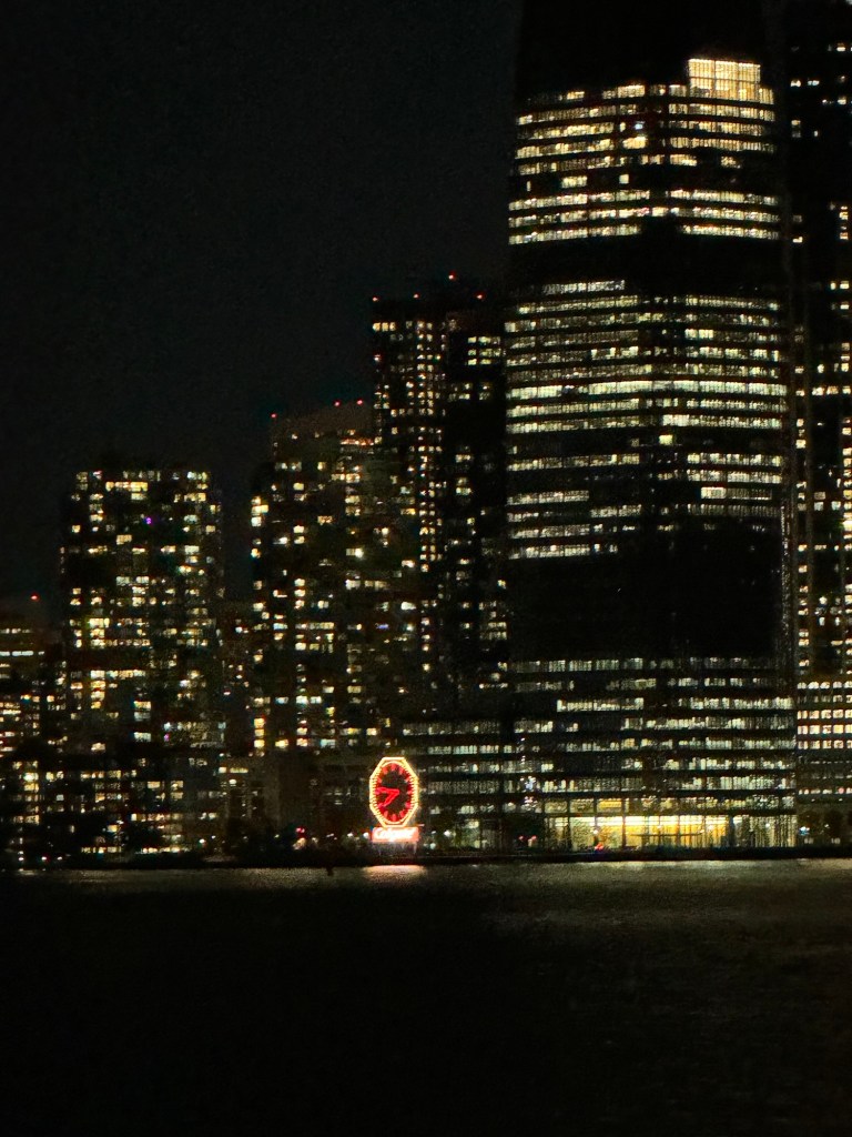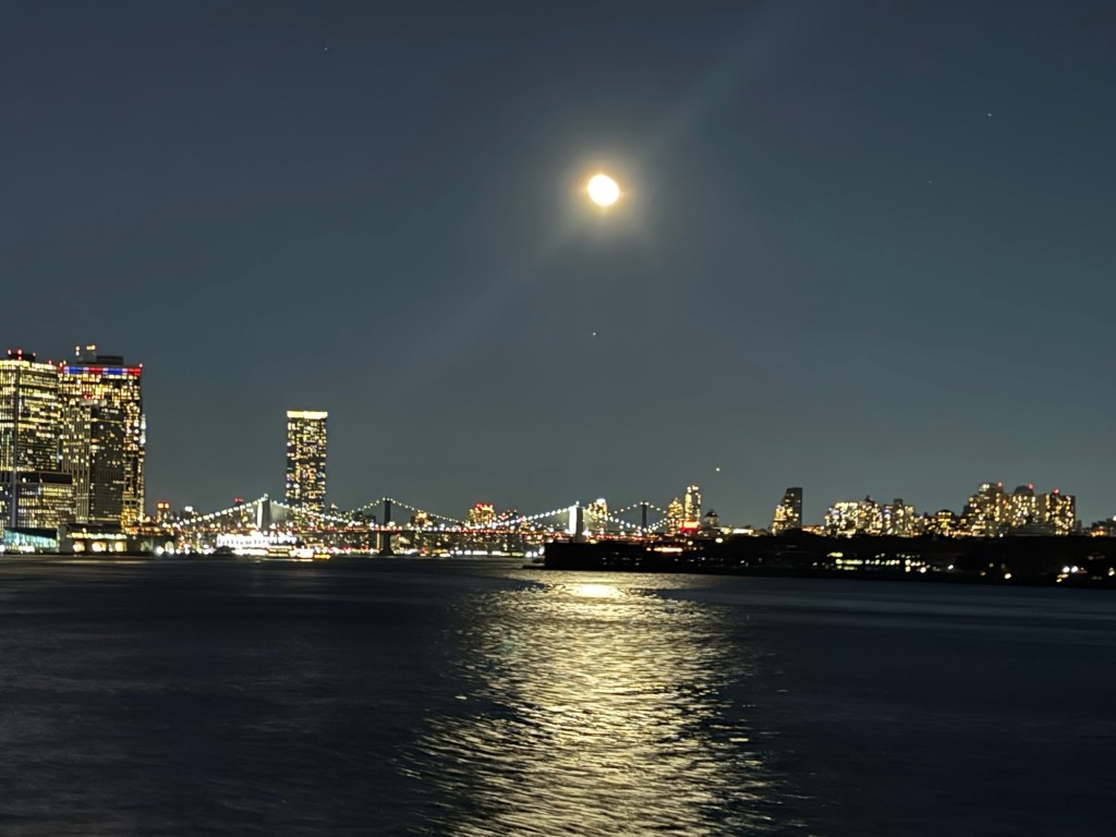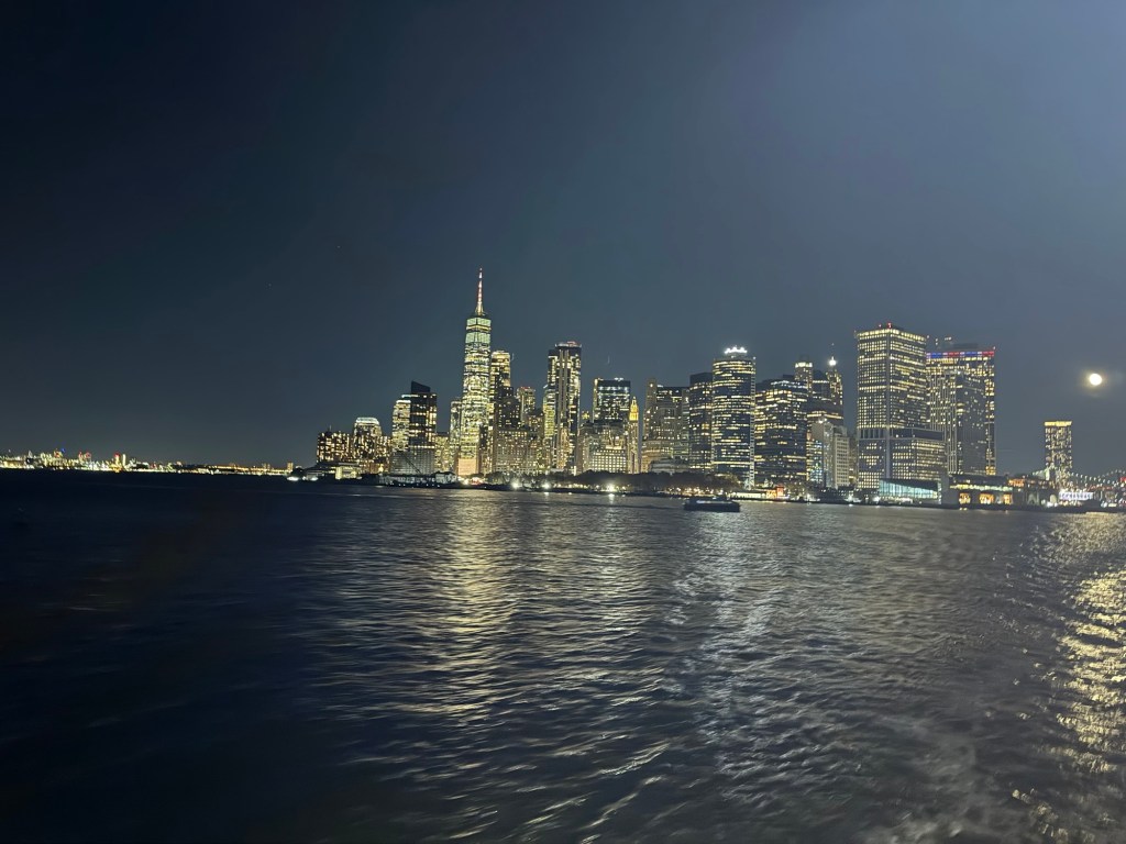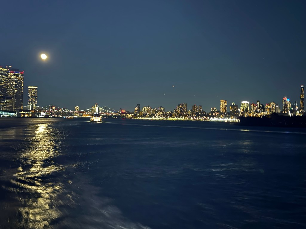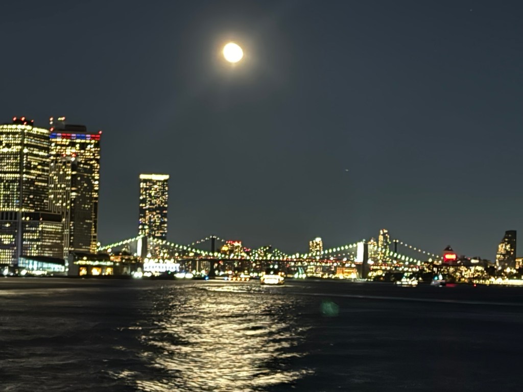 I enjoyed the ferry ride as much in the evening than I had in the morning. It was magical to see Manhattan all lit up. We still had an almost full moon, which was right over the Brooklyn Bridge. I managed to get some really nice photos. We were on the wrong side of the ferry for the Statue of Liberty, but I figured I would have another chance for some nighttime photos of the Statue of Liberty the following day, but the moon may not be as cooperative the next day. One we lost our view; we went inside as it was quite breezy. Shortly afterwards, we docked in Staten Island.