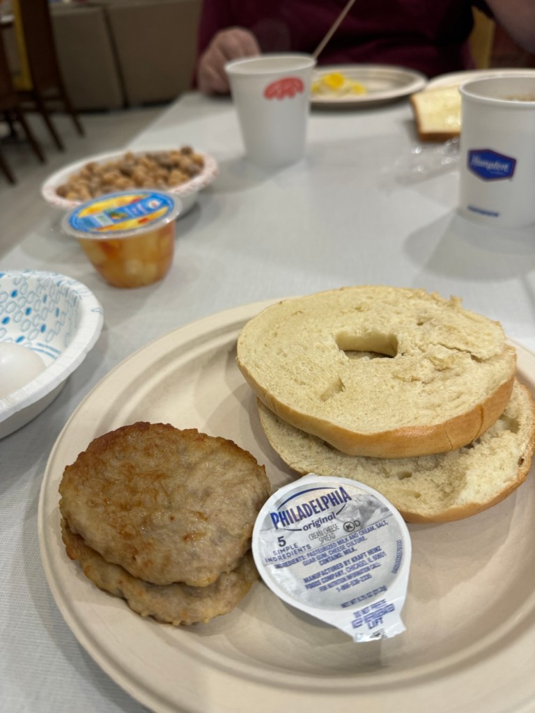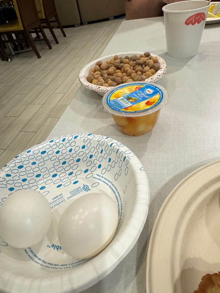 Sadly, all good things come to an end, and this was the day to go home. We had intended to have a bit of a lie in. I had set the alarm for 8:30. However, we were both awake at 08:00. We got up, took turns to have a shower and got dressed. Then we went downstairs for breakfast. Graham had fruit, yoghurt, scrambled egg on toast and some oatmeal with almonds, dried fruit and brown sugar. I had fruit cocktail, Reese’s Puffs cereal with milk, sausage patties, bagel with cream cheese and some boiled eggs. We both had juice and coffee.