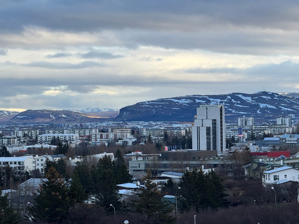 We had both slept well and woke up when the alarm went off at 08:00. We got up and ready. Then we headed downstairs for breakfast. I had my reservations about food in Iceland as it is heavily based around lamb and seafood, neither of which I will eat. I should have learned something from our first visit in China. I had spent weeks being worried if I would find something to eat. In the end, it was no issue. The same turned out to be the case in Iceland. The breakfast was a buffet and there was something for everybody. Graham had fruit and yoghurt to start off with followed by cold cuts, cheese and toast. I was keen to try out skyr, which is kind of between yoghurt and quark in flavour and texture. I went for mango skyr with chia seeds. I came to the conclusion that I love skyr, but I am at best indifferent to chia seeds. I then went for some hot food. They had hash browns that were very nice and some mini frankfurters. I also had a couple of boiled eggs. I was hoping for some traditional Icelandic pastries, but I was out of luck. They did however have some marble cake, and I had a slice of this. We both had a latte. Graham had some apple juice, and I had orange juice. I also had some sparkling water.