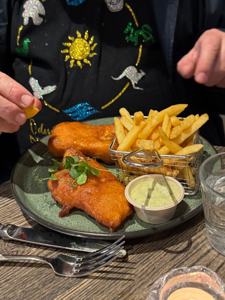 Graham had a soup of the day. He had also ordered a salmon pasta, but something was lost in translation, and he ended up with the fish and ships again. I had the club sandwich and asked for a side of fries. The food was lovely again. We both just had water.