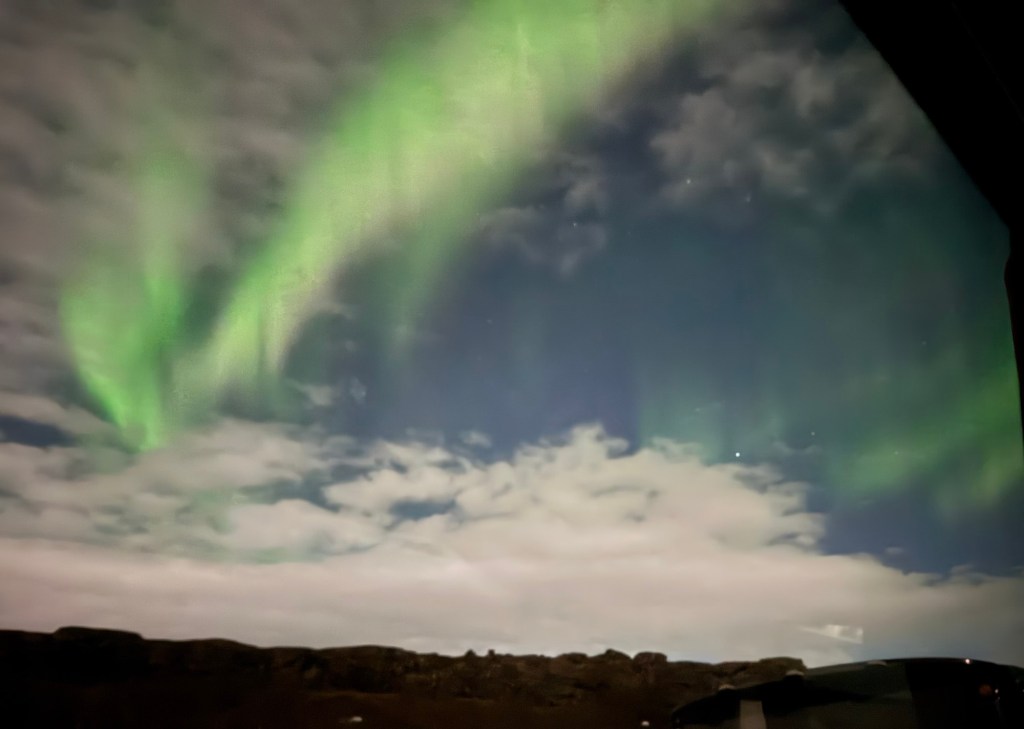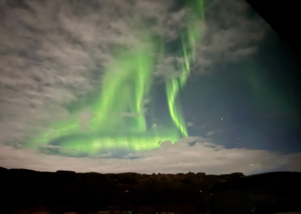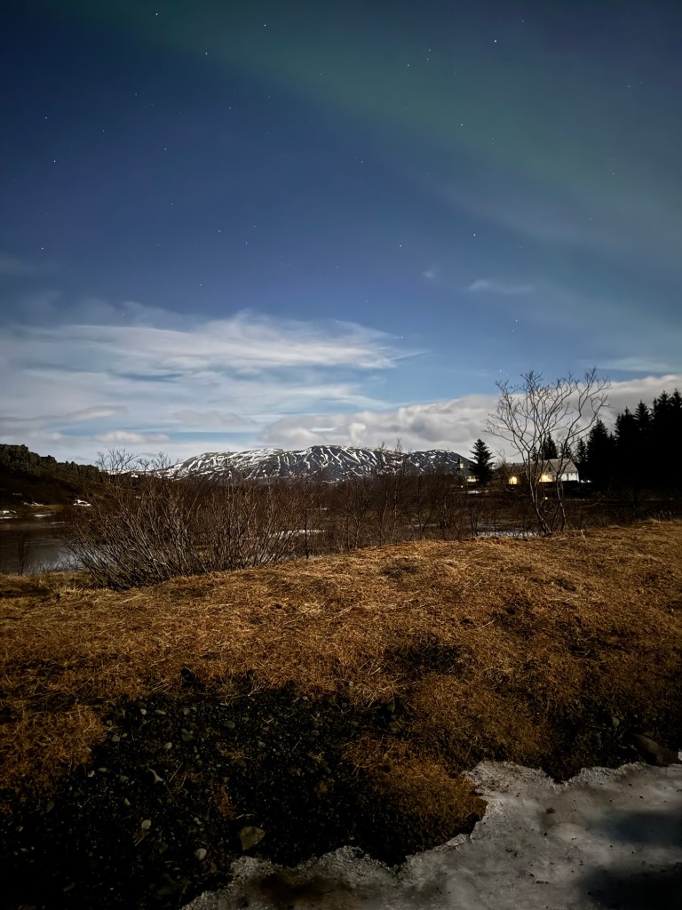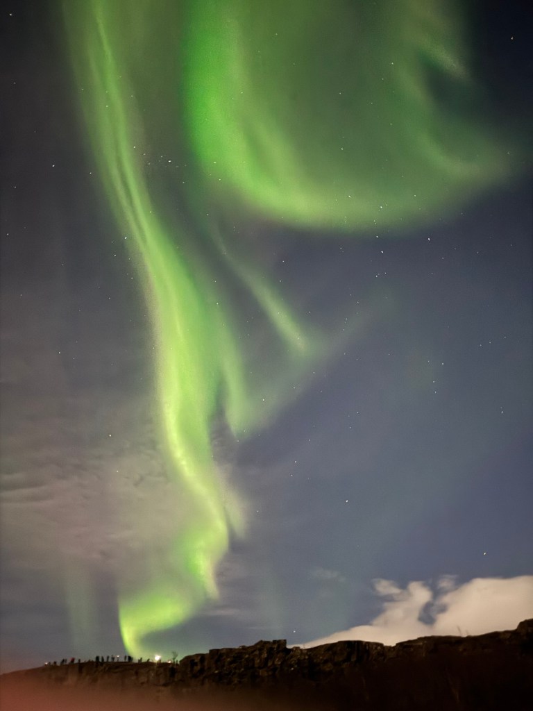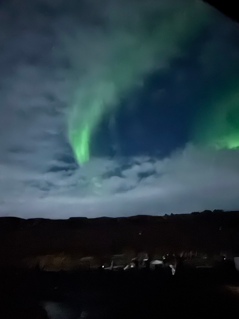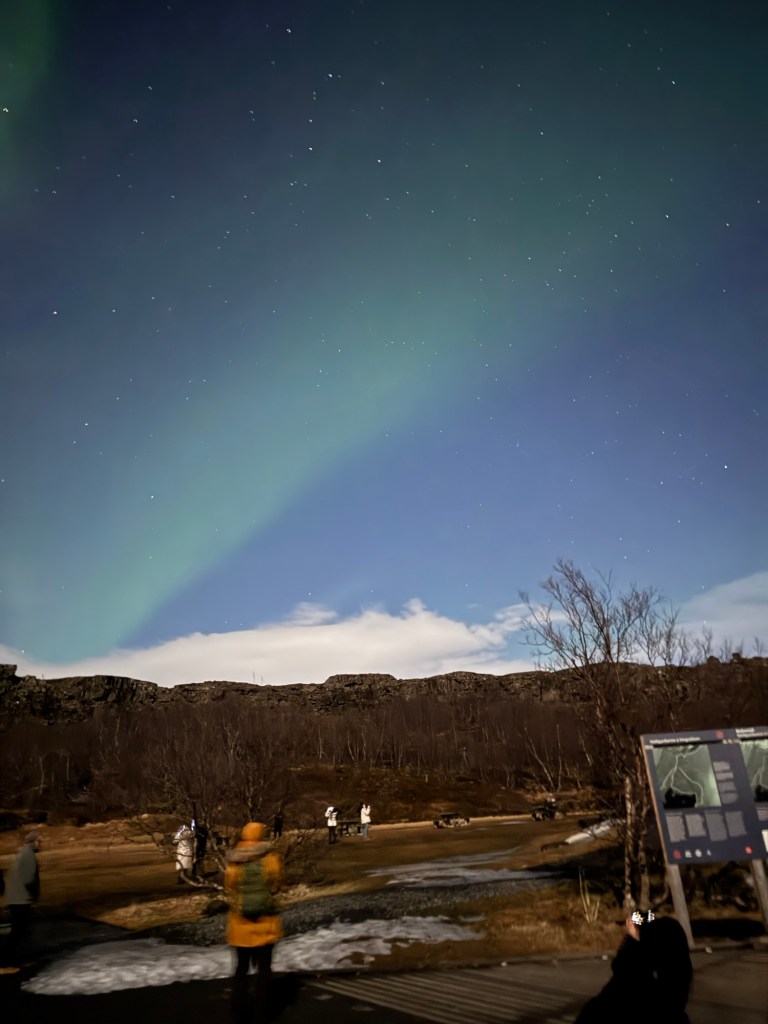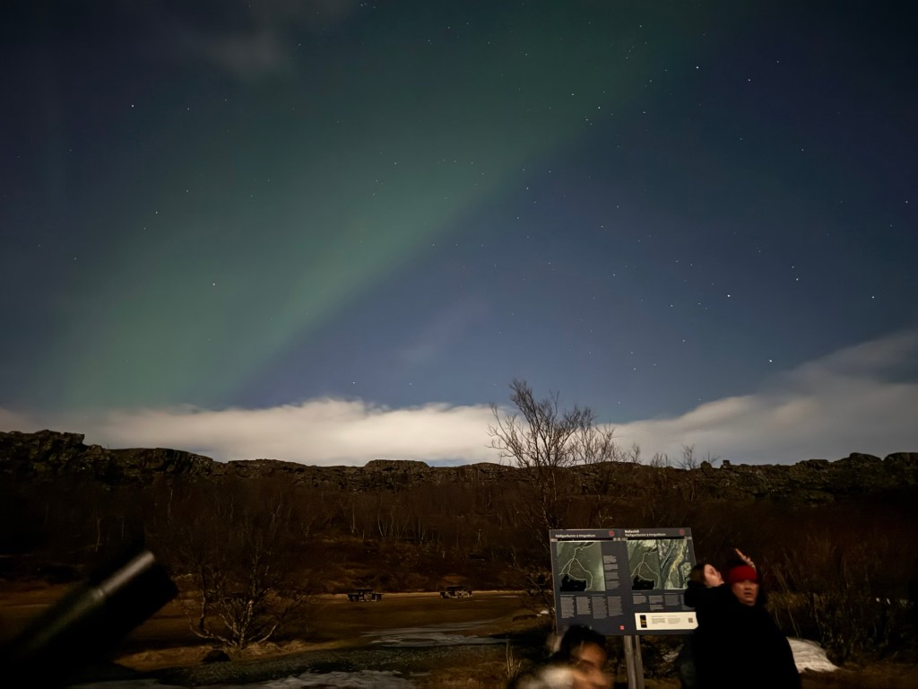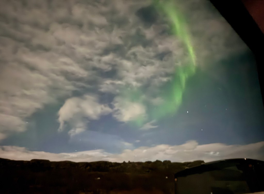 We arrived at Thingvellir National Park at around 22:00 and the aurora forecast stated that the window to see the Northern Lights would open at 23:00. We were in for a bit of wait. Or so we thought. I decided to get a feel for how my phone would react to the conditions and pointed my phone towards the nearby mountains. When I looked at the photo, there was some green in the top right corner of the frame. I showed this to Graham, and he thought that this was definitely the beginning of an aurora. We had been told to stay vigilant as some just peter out, but then suddenly another one can start in a different place. Well, this one did not peter out. Shortly afterwards, there were silver grey lines and swirls everywhere. I was not quite sure where to point my phone. I had finally got my wish and had seen the Norther Lights.