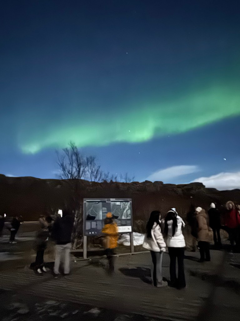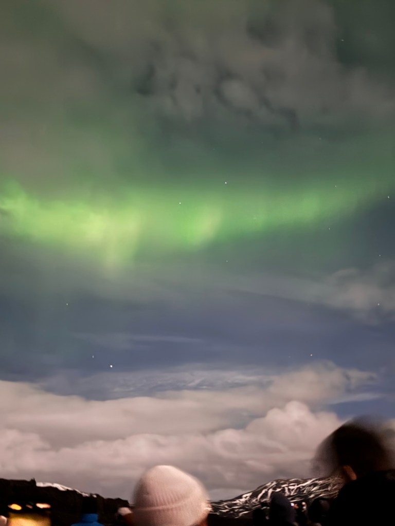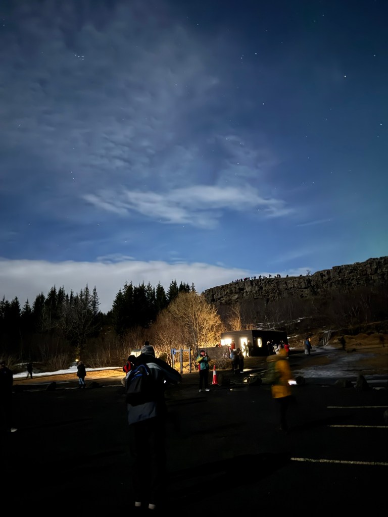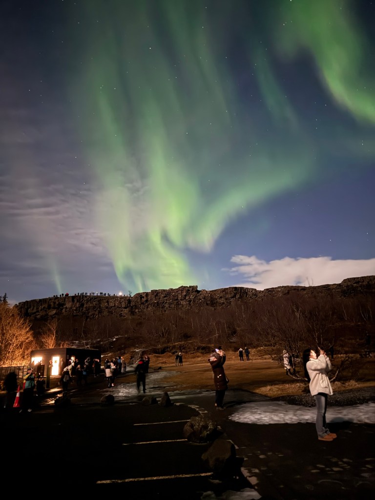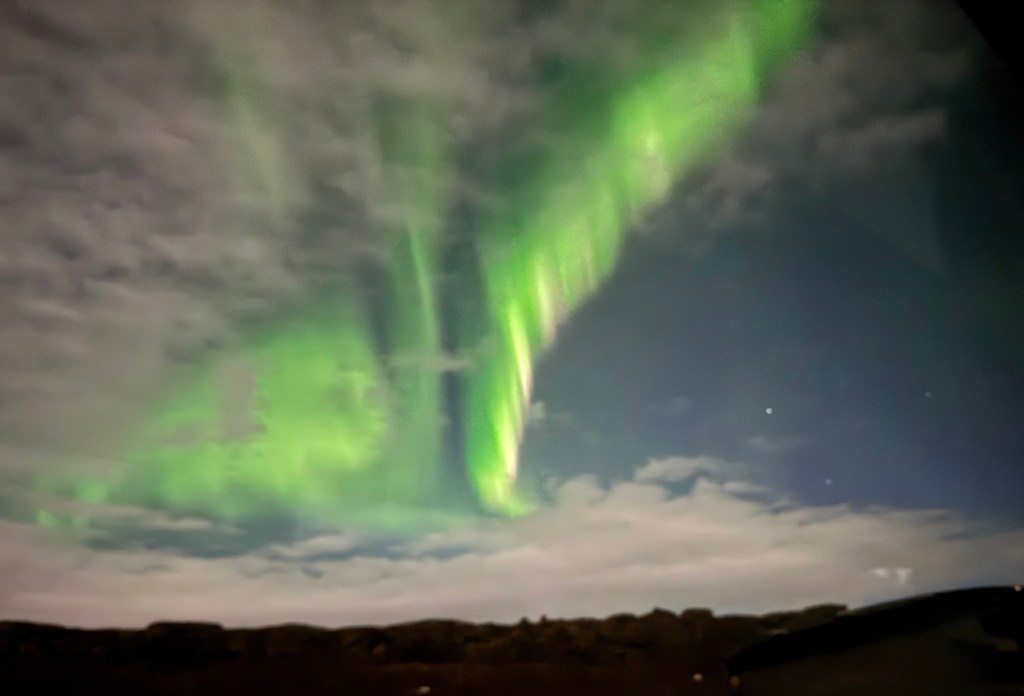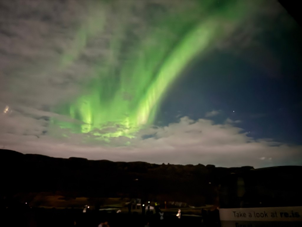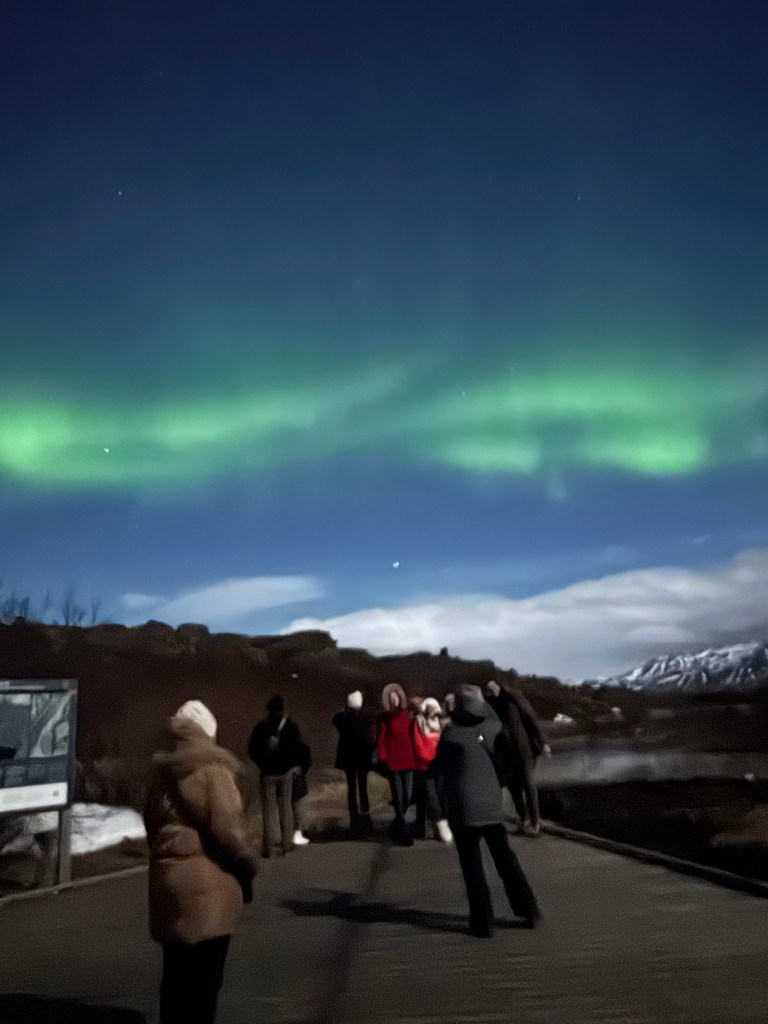 We arrived at Thingvellir National Park at around 22:00 and the aurora forecast stated that the window to see the Northern Lights would open at 23:00. We were in for a bit of wait. Or so we thought. I decided to get a feel for how my phone would react to the conditions and pointed my phone towards the nearby mountains. When I looked at the photo, there was some green in the top right corner of the frame. I showed this to Graham, and he thought that this was definitely the beginning of an aurora. We had been told to stay vigilant as some just peter out, but then suddenly another one can start in a different place. Well, this one did not peter out. Shortly afterwards, there were silver grey lines and swirls everywhere. I was not quite sure where to point my phone. I had finally got my wish and had seen the Norther Lights.