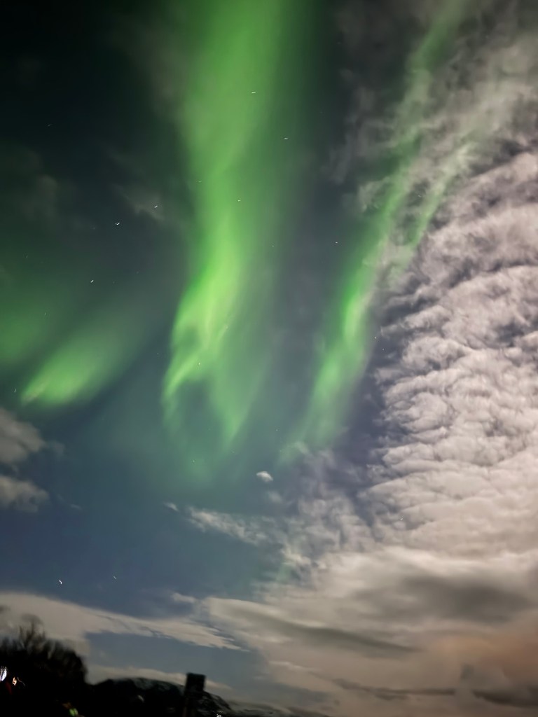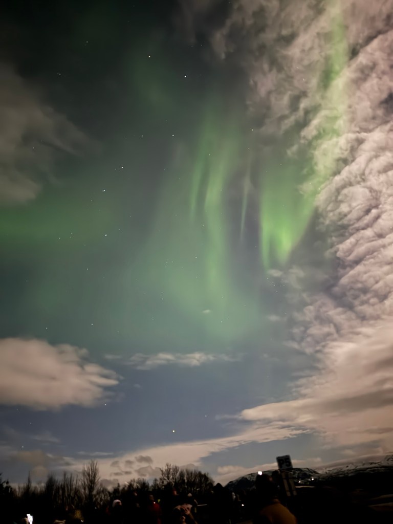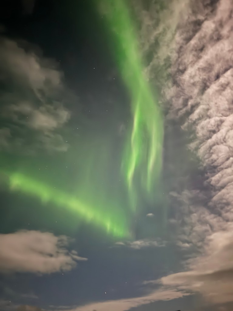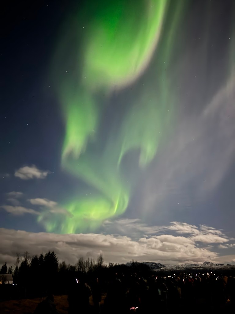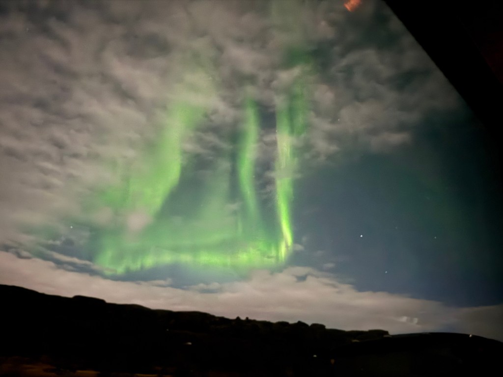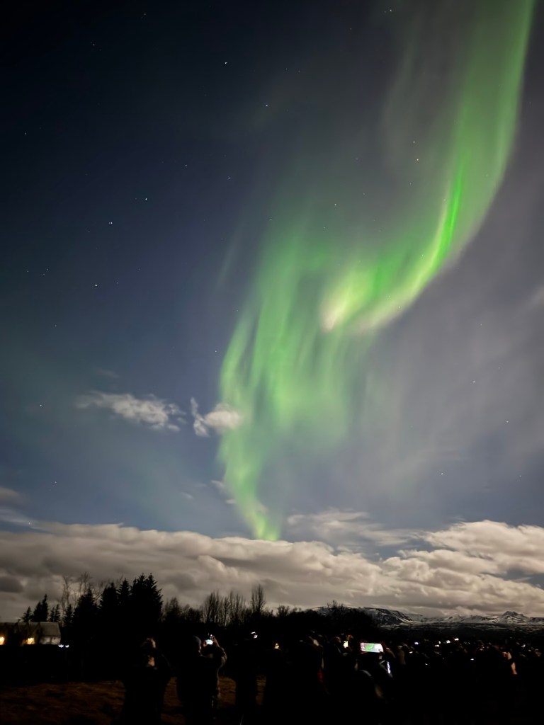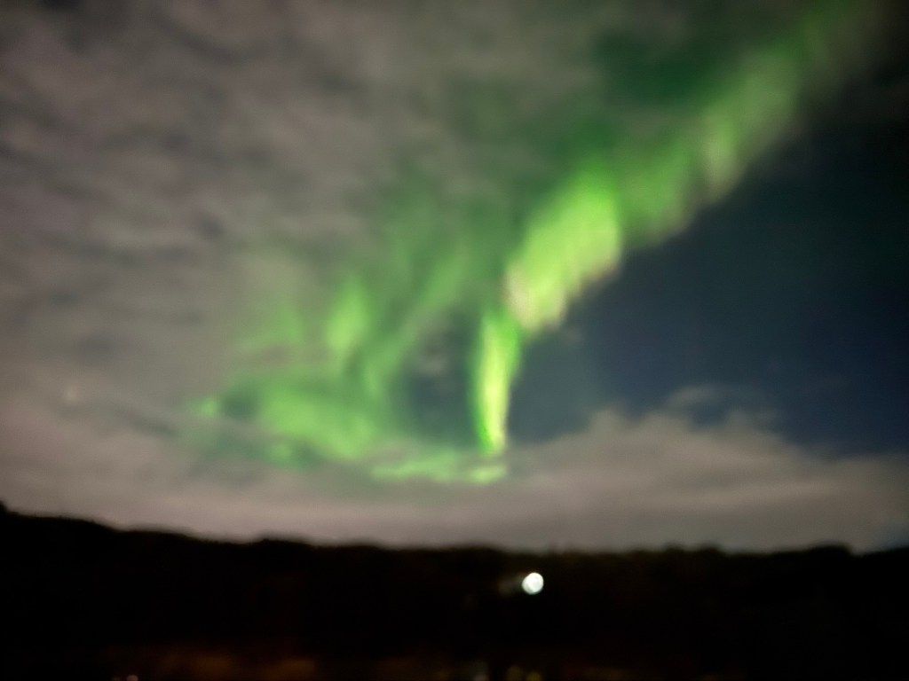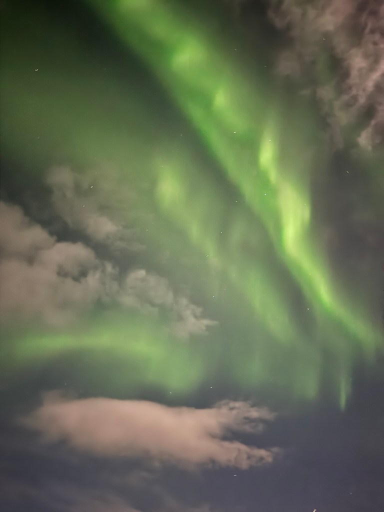 We arrived at Thingvellir National Park at around 22:00 and the aurora forecast stated that the window to see the Northern Lights would open at 23:00. We were in for a bit of wait. Or so we thought. I decided to get a feel for how my phone would react to the conditions and pointed my phone towards the nearby mountains. When I looked at the photo, there was some green in the top right corner of the frame. I showed this to Graham, and he thought that this was definitely the beginning of an aurora. We had been told to stay vigilant as some just peter out, but then suddenly another one can start in a different place. Well, this one did not peter out. Shortly afterwards, there were silver grey lines and swirls everywhere. I was not quite sure where to point my phone. I had finally got my wish and had seen the Norther Lights.