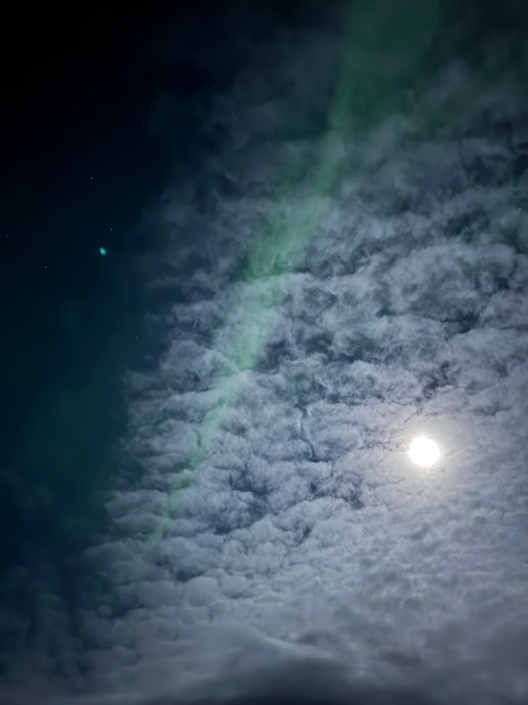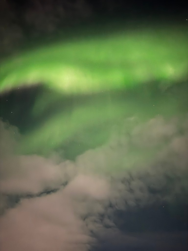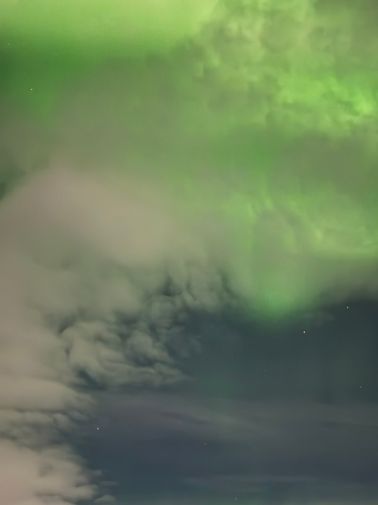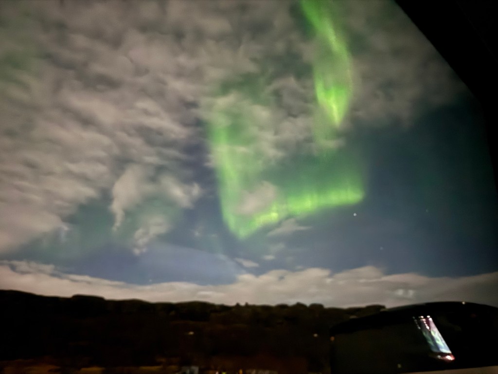 Once they had petered out, we once again headed over to our coach. This time we had made it to our seats when the Northern Lights came back. By that time, we were a matter of minutes from our schedule departure, and we stayed put. We still got to enjoy them from the coach though.