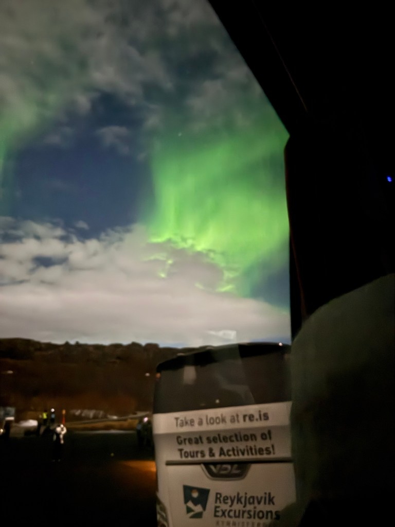 Soon we were on our way. Our guide introduced our driver and herself. She explained that we were heading to Thingvellir National Park, which is about a 45-minute drive from Reykjavik. We would return there later in the week during daylight. She explained a bit about Thingvellir National Park, but for most of the tour, she concentrated on the Northern Lights. She explained that what causes them and that usually the naked eye cannot see the colours and instead encouraged us to look for silver grey lines. She also gave instructions on what settings people needed for their cameras and phones. The good thing was that new iPhones automatically find the right settings. I was good to go. The aurora forecast for that evening was moderate and the weather forecast was favourable. Twice on the journey there, we were instructed not to leave the area where the coaches were parked. The terrain around there is uneven with a lot of rocks and there is an ice river adjacent to the bus parking area. She also warned us that we would be in total darkness.