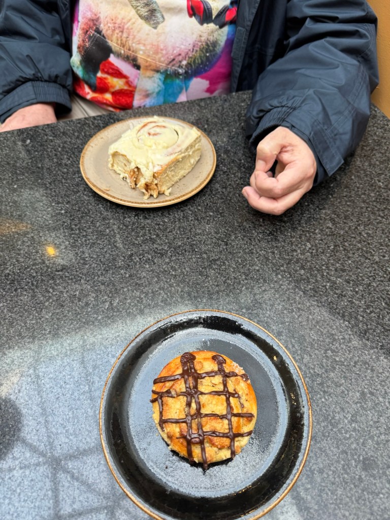 When we were thoroughly frozen, we headed back to the shopping centre. Graham used the bathroom, and I stayed downstairs near the bakery. We decided we were ready for a snack when Graham came back. Graham had a latte and a cinnamon roll. I had a flat white and a pistachio pastry, which was delicious.