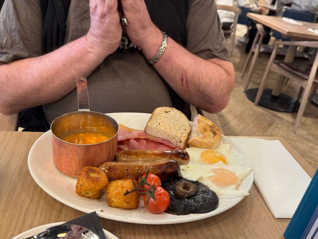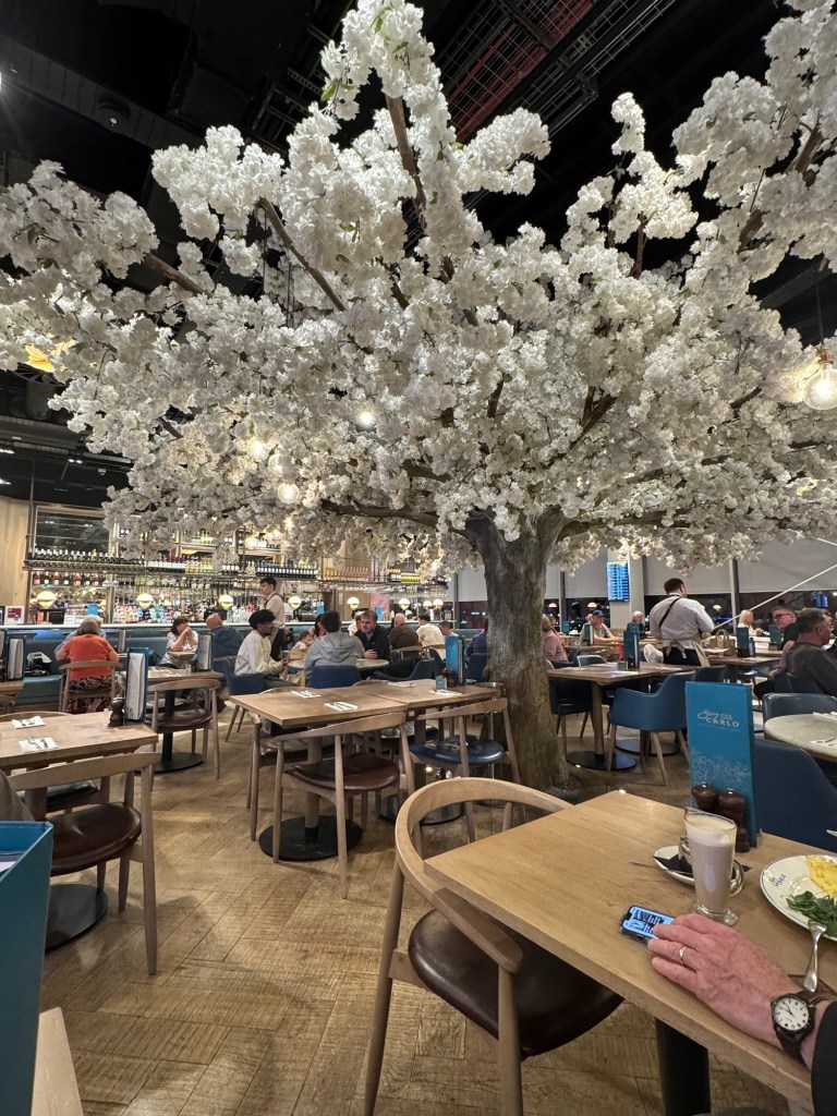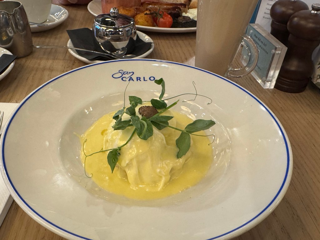 After this, we went to get some breakfast. Normally, we end up having breakfast at Giraffe if we have a morning flight out of Manchester. There is now a Giraffe in terminal two, but temptation led us to San Carlo, which is next door. San Carlo is an upscale Italian chain. Graham had an Americano and the San Carlo Grande, which consisted of back bacon, Cumberland sausages, roasted tomatoes, flat mushroom, crispy potato cakes, baked cannellini beans & fried eggs with toasted sourdough bread. I had a latte and the Truffled Eggs en Croute, which consisted of poached eggs on toasted sourdough bread with truffle fondue sauce. Everything was delicious and the ambience was nice.