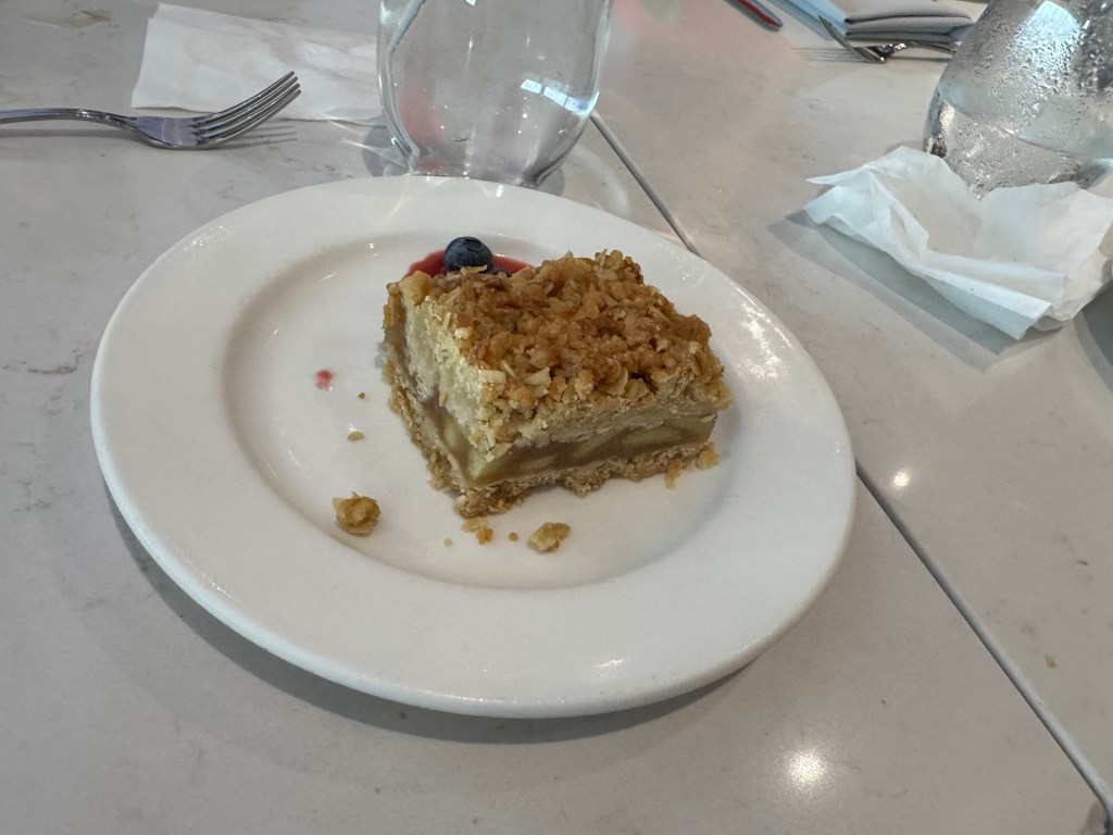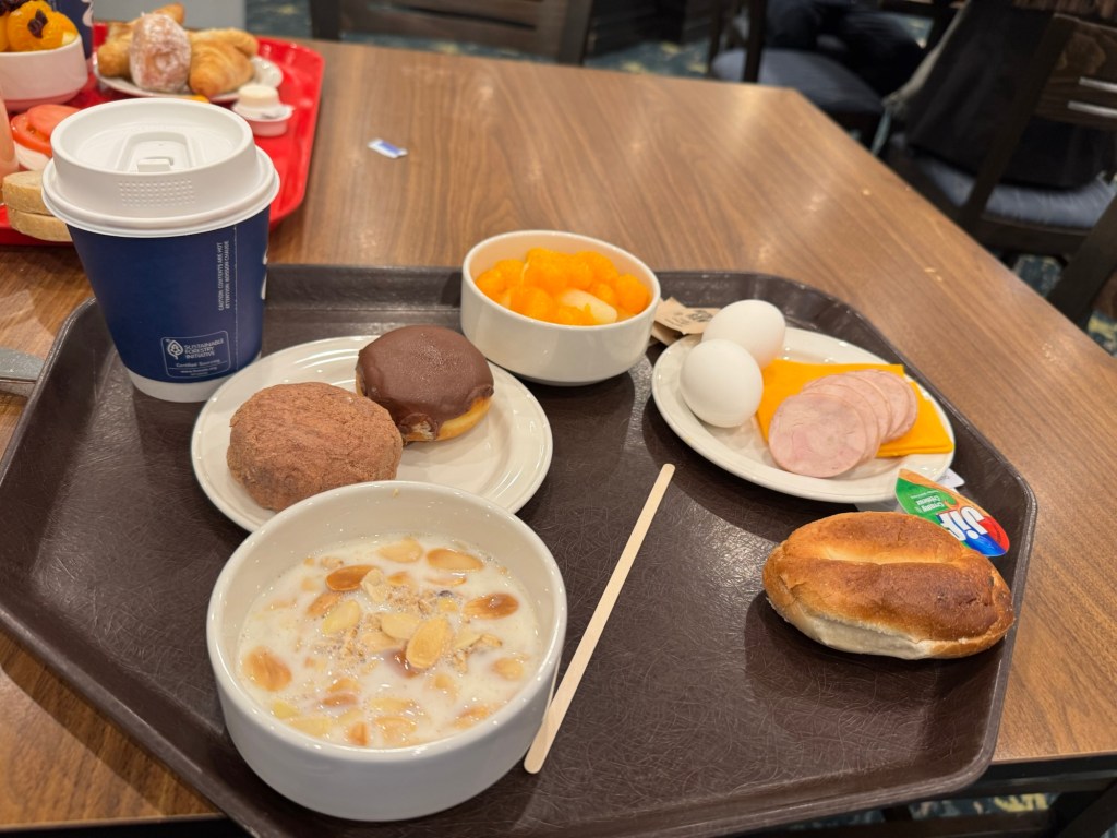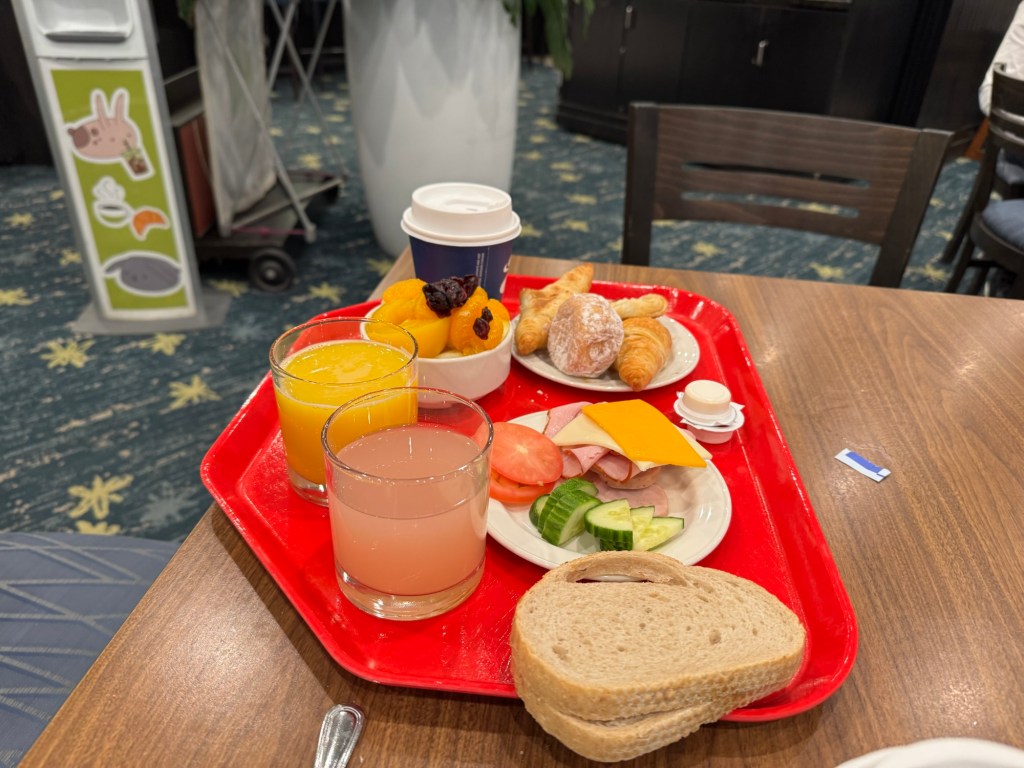 We had continental breakfast included. This was served at the marketplace. This was a combination of a coffee shop, a grab and go area and a buffet. They had a great spread. Graham started with some fruit. He then had some mini pastries and a donut followed by cold cuts, cheese, tomato, cucumber, and bread. He also had some coffee and grapefruit juice. I started with tinned pears and mandarin oranges and some granola with sliced almonds. I also had a Boston cream and a cinnamon donut. I followed this some cheese , sausage, and boiled eggs as well as a roll with peanut butter. This little lot was washed down by some coffee and orange juice.