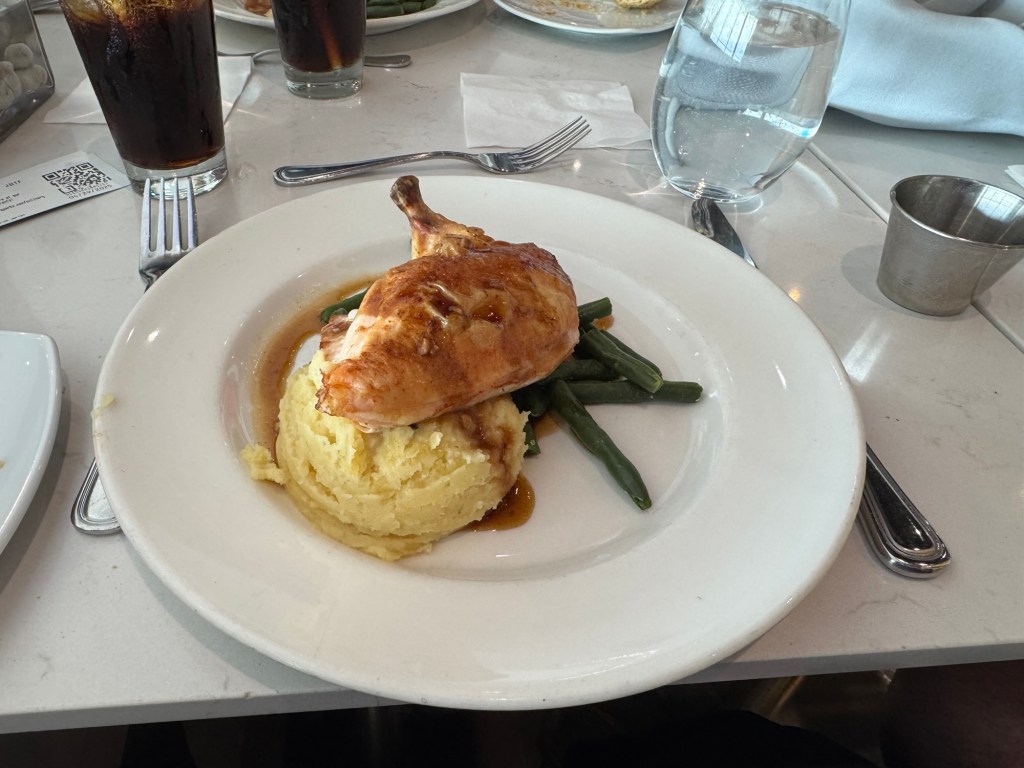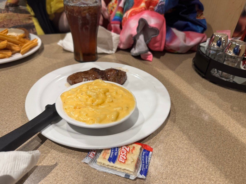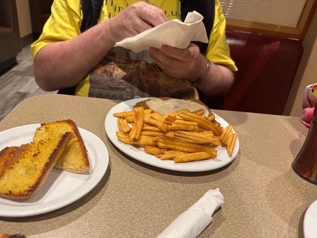 We headed back to our room to drop off our stuff. I put the wine into our mini fridge. I took one of my tablets and then we headed out for dinner. I had spotted a couple of weeks earlier that there was a Denny’s not too far from our hotel. This was where we went for dinner that day. I had worked out via Google Maps how to get there. Graham has a certain disdain for Google Maps and decided to find his own route. It did not take long to get there. Denny’s was relatively empty. Graham had iced tea, and I had some Coke. He had chicken fried steak with fries and garlic bread. I had Sirloin steak which came with a choice of two sides. I went with baked macaroni cheese, and tomato soup. It also came with some garlic bread. We both agreed that it was not quite as nice as we are used to, but it was still pleasant enough.