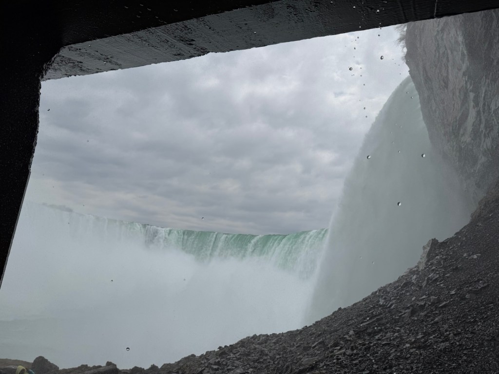 The advantage of this was that we did not have to go very far. We just had to go down one level and walk to the other end of the building to check in for Journey behind the Falls. As we had our tickets already, we could head straight in. We had a photo taken against a green screen. Then we were given a disposable poncho and sent to the elevator. The access to the 130-year-old tunnels is 125 feet below the visitor centre. The first tunnel we got to led to a two-level observation platform. We had a look at the upper level. I was joking that I was having my fourth shower of the day. The ponchos prevented us getting soaked, but I could actually see very little as water covered my glasses. I figured I could save myself the stairs to the lower level as I would not be able to see anything anyway. Instead, we retraced our steps and headed down the second tunnel. This leads to two portals that are looking out over the bottom of two different areas of the falls. At least you could keep out of the way of the mist there. However, visibility was rather limited. I was in two minds about this attraction. When I worked as a travel agent, I booked this hundreds of times. I kind of doubted the wisdom of this. On the positive side, it is fairly inexpensive, and I have to admit witnessing the roar and sheer power of the falls is impressive. However, the very limited visibility is a deal breaker for me. I can imagine that during the winter when the falls are frozen, this would be a very cool thing to do.