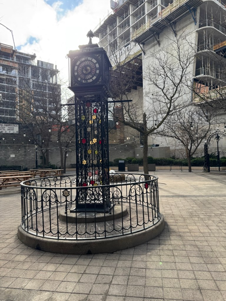 I had spotted a beautiful clock in courtyard outside the buffet the day before. I decided to check if I could get out there. I found a door and took some photos. This was when I realised just how lucky we were. While we had enjoyed summer weather in Niagara the day before, Toronto had thunderstorms and hail bringing cooler weather with them. The temperature that day never went above the low teens, but with beautiful blue skies and sunshine plus the fact that most parts of Toronto are very sheltered, it felt warmer than this. It was perfect walking weather. On the flip side, Niagara had heavy rain that day. If we had switched our itinerary around, it would have been utterly miserable. Fortunately, we were similarly blessed for most of our trip.