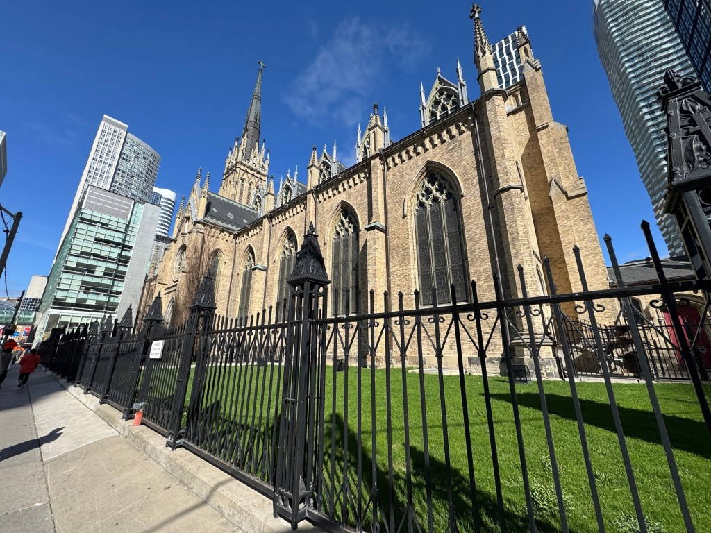 On the way to the St. James’s cathedral, we passed another beautiful church. Metropolitan United Church is a historic Neo-Gothic style church. It is one of the largest and most prominent churches of the United Church of Canada. The church was built around the same time as St. Michael’s Cathedral. Unfortunately, it was not due to open for another two hours. I would have loved to have a look inside. I could spot some interesting looking stained-glasswindows from the outside. Indeed, the church is famous for its stained-glass windows. We definitely have to check this out when we come back to Toronto.