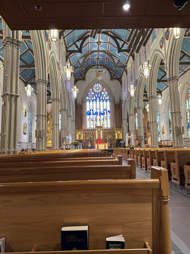The cathedral in question was St. Michael’s Cathedral Basilica, which is the Roman Catholic Cathedral of Toronto. It is one of the oldest churches in Toronto and was designed in the English Gothic Revival style. The original church was built in the mid 19th century, but has gone through multiple renovations and additions.