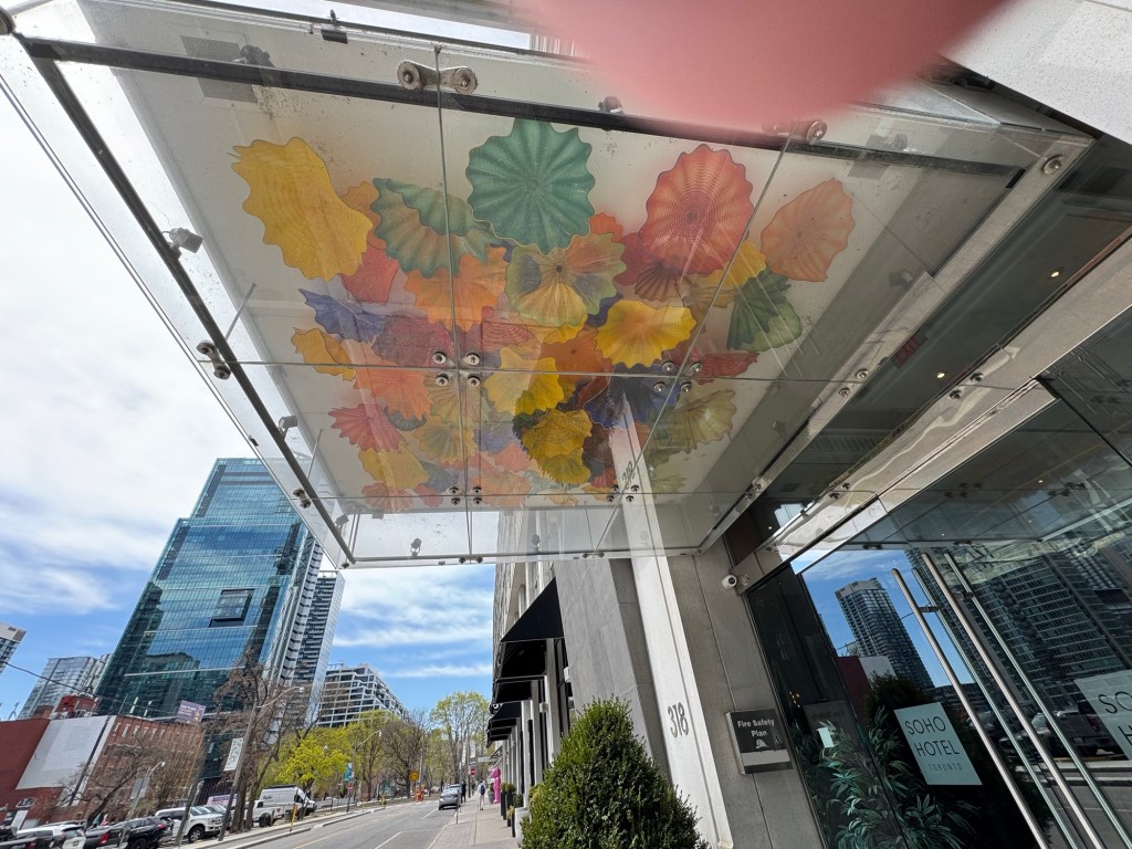 At the other end of the square was one of the access points to the PATH. The PATH is a large underground pedestrian network connecting office towers, retail areas, and other buildings. It’s considered the world’s largest underground shopping complex, spanning over 30 kilometres (19 miles) of tunnels and walkways. We decided to have a look. The part that was in this area is currently being refurbished. There was not a great deal open. We went back up to street level. From there, we were only a short distance away from the Soho Metropolitan hotel where the Chihuly installation is.