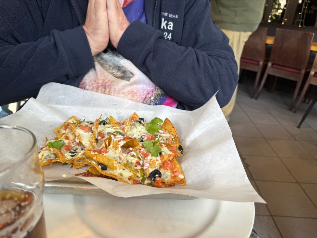 Instead, we ended up at a place called Rex’s Bar and Grill. This was a rather grand name for what it was. I think the technical term for places like this is a dive bar. It had a slightly seedy feel to it. There was a lot of outside seating, and they had a barbecue going. Inside were a few ordinary tables as well as some high tables with no chairs or stools near the bar. The menu was a laminated sheet of paper. Still, service as good and it was encouraging that there were plenty of locals around. The food was simple, but tasted amazing. Graham had nachos, which he really enjoyed. I had the home-made chicken tenders with fries, and slaw. Normally they come with honey-mustard dressing, which I don’t like. I did spot that they had ranch dressing on the menu, and I asked for this instead. The chicken tenders were amazing. They were very crunchy on the outside and tender and juicy on the inside. They may well have been the best chicken tenders I ever had. The sides hit the spot, too. Graham had a local IPA with his dinner, but as we still had wine in the room, I just had a Coke.