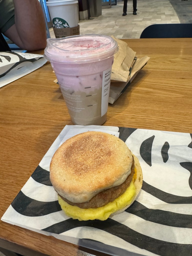 When the alarm went off, Graham went to have a shower as well. Then we were discussing breakfast options. Graham suggested we just go to the Starbucks in the lobby. I was fine with this idea. Once we were both ready, we headed downstairs. We both had a sausage, egg, and cheddar sandwich. Graham also had a slice of lemon drizzle cake and an Americano. I had a piece of cinnamon coffee cake and an iced cherry chai latte. I was not entirely sure what to expect, but I love chai and anything cherry. It turned out that it was a standard iced chai latte with cherry cold foam on top. It was delicious. As delicious as it was, I had a slight case of FOMO. Before I placed the order, I checked if they still do nitro cold brew. This is my favourite cold drink at Starbucks, but it has shown as permanently sold out for months back home. The fact that I did not see it on the menu made me think that it was no longer available in Canada either. However, while I was waiting for our drinks to be made, I noticed that the barista made a nitro cold brew for somebody. I told Graham about this, and he suggested that I should have one. I was not sure if I wanted to queue again, but then I spotted that I could order this via mobile order. I had a vanilla sweet cream nitro cold brew with chocolate cold foam, which was delicious.
