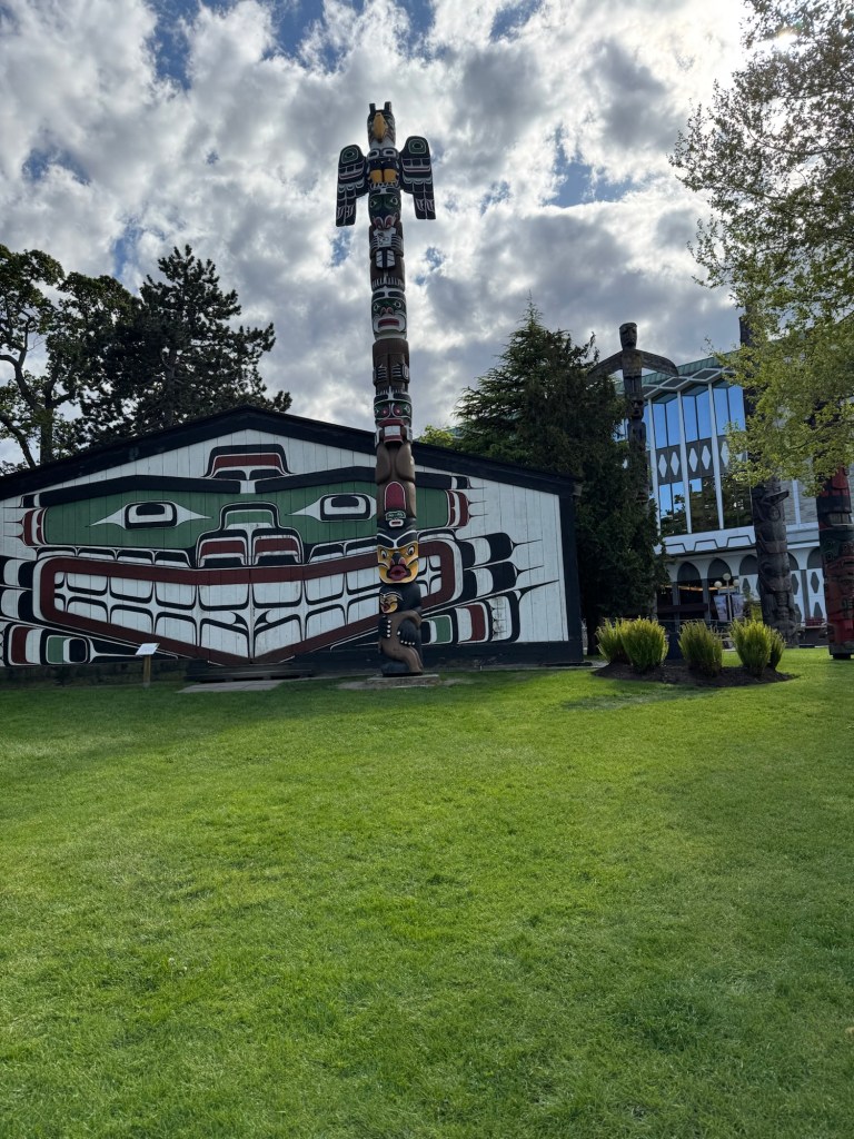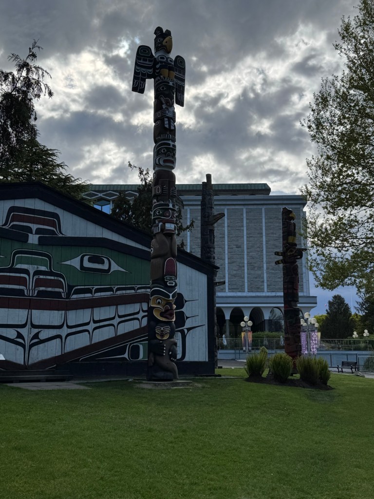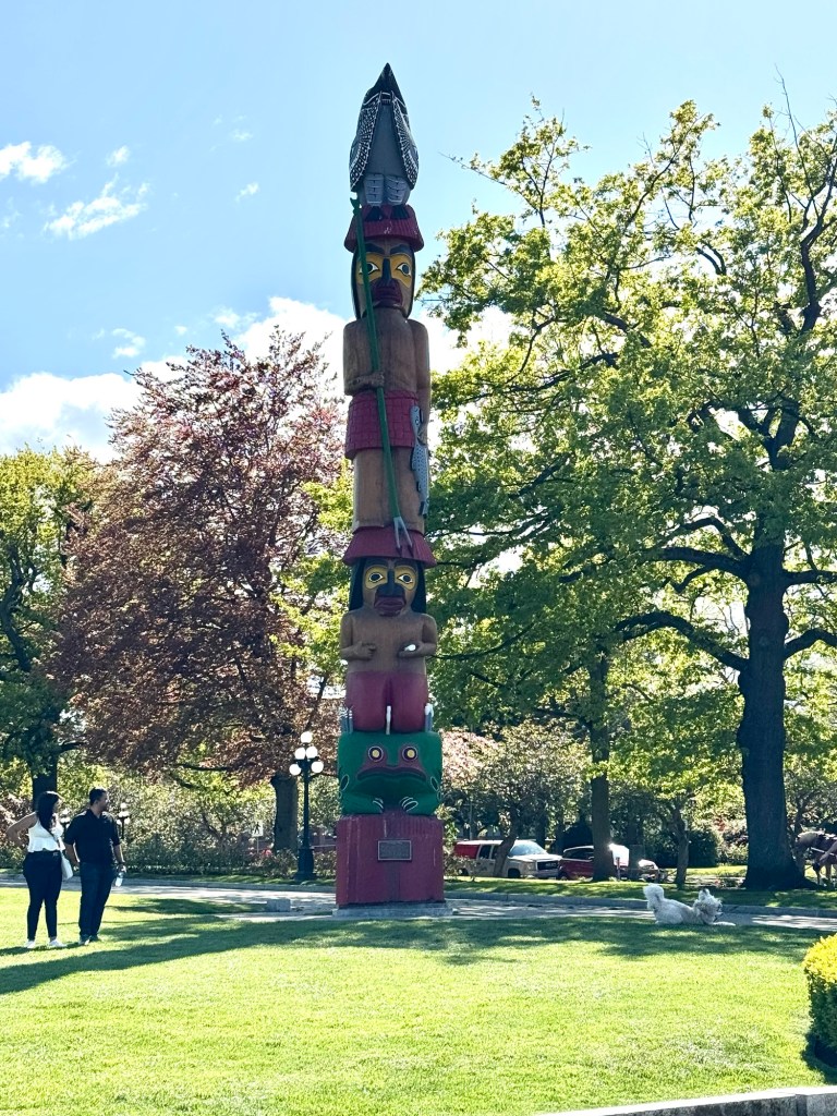 There was one more thing nearby that I wanted to see. This is Thunderbird Park. Thunderbird Park is part of the neighbouring Royal BC Museum. Thunderbird Park was created in 1941 to display the growing collection of totem poles that were part of the museum’s collection. Unfortunately, about 10 years later, the totem poles had significantly decayed. The museum started a restoration program and hired a master carver. Over a number of years, the original poles were moved to inside storage and replaced by replica versions. All of the poles now in Thunderbird Park were carved in the Carving Studio building there. All but two of the totem poles on display there are versions of the originals. When it was constructed in 1941, Thunderbird Park featured a Northwest Coast-style house with an inaccurate frontal painting produced especially for the building. There were also original carvings from many different First Nation people on display and none of it belonged together. The present building was created by Thunderbird Park’s original master carver and is considered authentic. It is used for events by the local First Nation people.