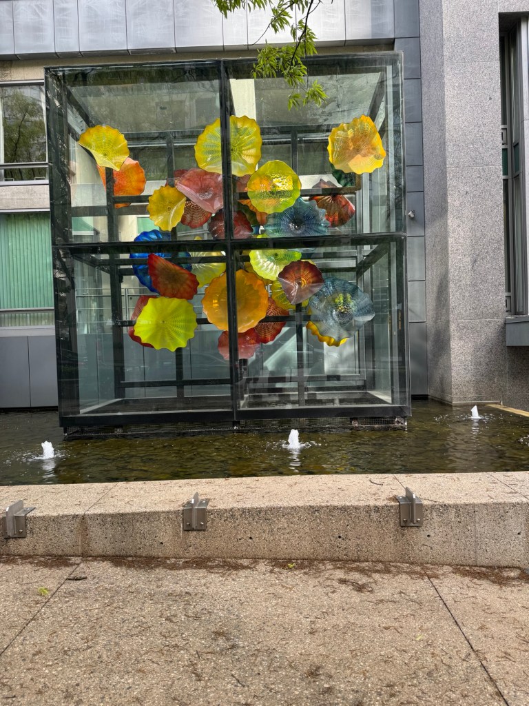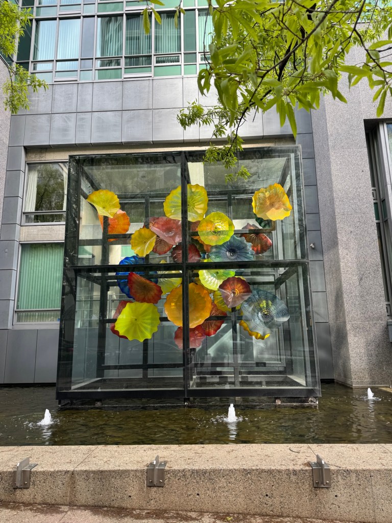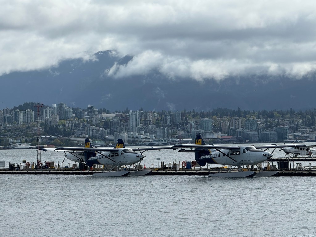Once we had finished our breakfast, we packed the bulk of our stuff. There was not that much to pack as we had only been in Vancouver for two nights. It was still quite early, and I suggested that we make a little detour on our way to Canada Place. The Flower Pool fountain that features a Chihuly Persian Wall glass installation was not far from the hotel. Better still, the north south road that this was on would essentially drop us right by the sea plane terminal. This time, Graham’s gut feeling found us the quickest route. Google maps wanted to send us two blocks further uphill. We spent a short while admiring the fountain and I took some photos before we headed downhill towards the sea plane terminal. Part of this walk goes through a little park by the seafront which is quite pretty.