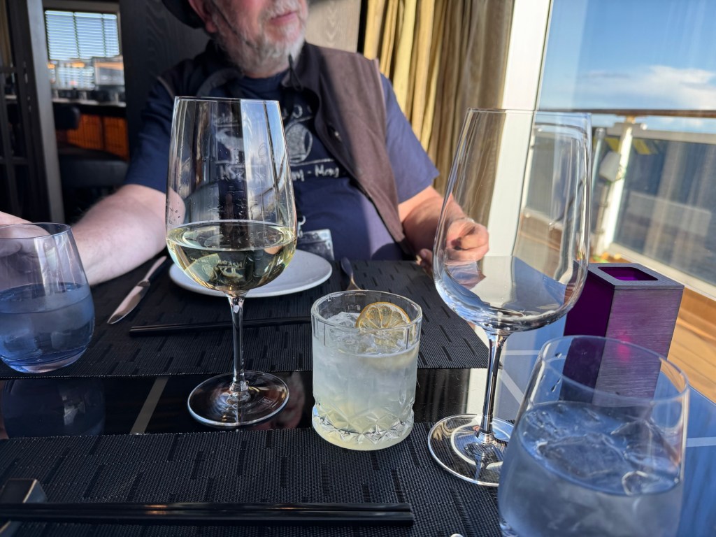 Graham suggested that we go somewhere where we have view as he was hoping for a decent sunset. Koningsdam has cool venue on deck 12 that it is called The Crow’s Nest. This is an observation lounge, but also has an arts and crafts studio, and an area to play games or do jigsaw puzzles. The shore excursion desk is also up there plus a bar and a coffee bar. We managed to get seats by the window and settled down. We decided while we were there, we may as well have nightcap.