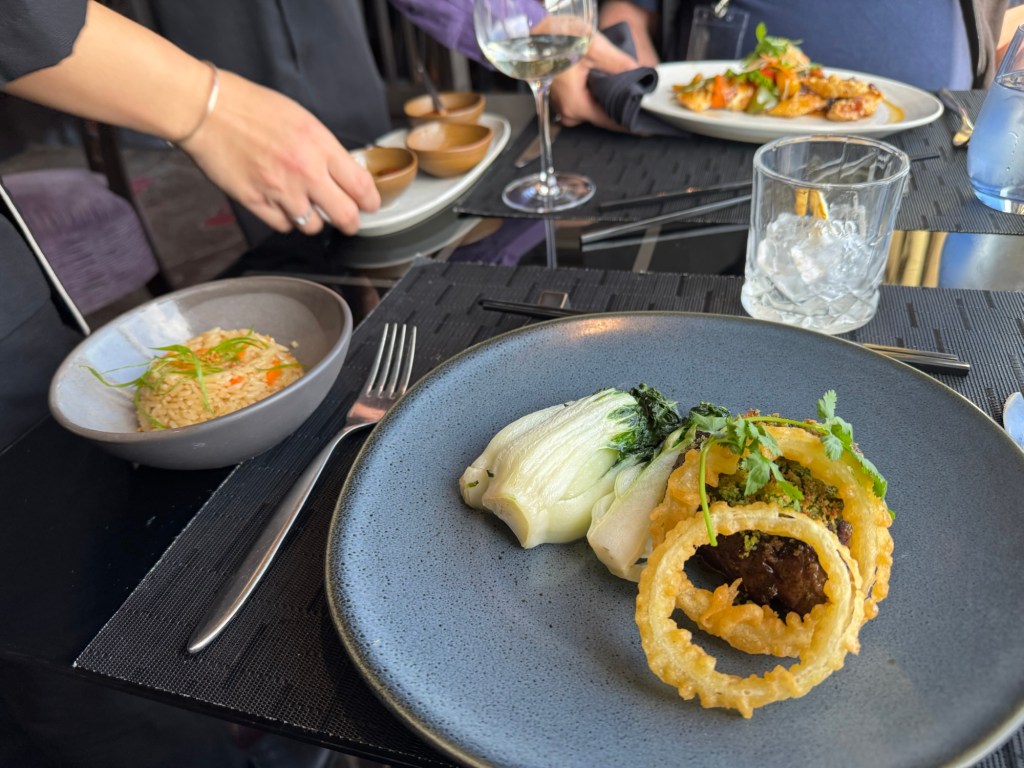 Graham started with the shrimp tempura with sweet and sour sauce and sesame noodles. I could not make up my mind between two starters. As I had not eaten since I had half the rhubarb and strawberry pie in the morning, I decided to have both. I had the satay sampler, which normally consists of a Malaysian lamb skewer, an Indonesian chicken skewer, a Thai pork skewer, peanut sauce and ajad cucumber relish. As I do not eat lamb, our server asked if I wanted another chicken or pork skewer instead. I went with the pork option. I also had the Lumpiang Shanghai with minced pork, egg roll wrap, sweet chili sauce and green papaya. By the time we had our starters, we had realised that Tamarind was something very special. For his main course, Graham had crispy fried sea bass. I had wasabi & soy crusted beef tenderloin with tempura onion rings and tonkatsu sauce. We both had some egg fried rice as a side. I was stuffed after this, but there is always room for ice cream. Graham had the mango posset, which consisted of a coconut macaroon, passion fruit jelly and mango sorbet. I had the selection of house-made sorbets: lemon-basil, yuzu, and lychee. The lemon-basil was very unusual, but my favourite was the lychee.
