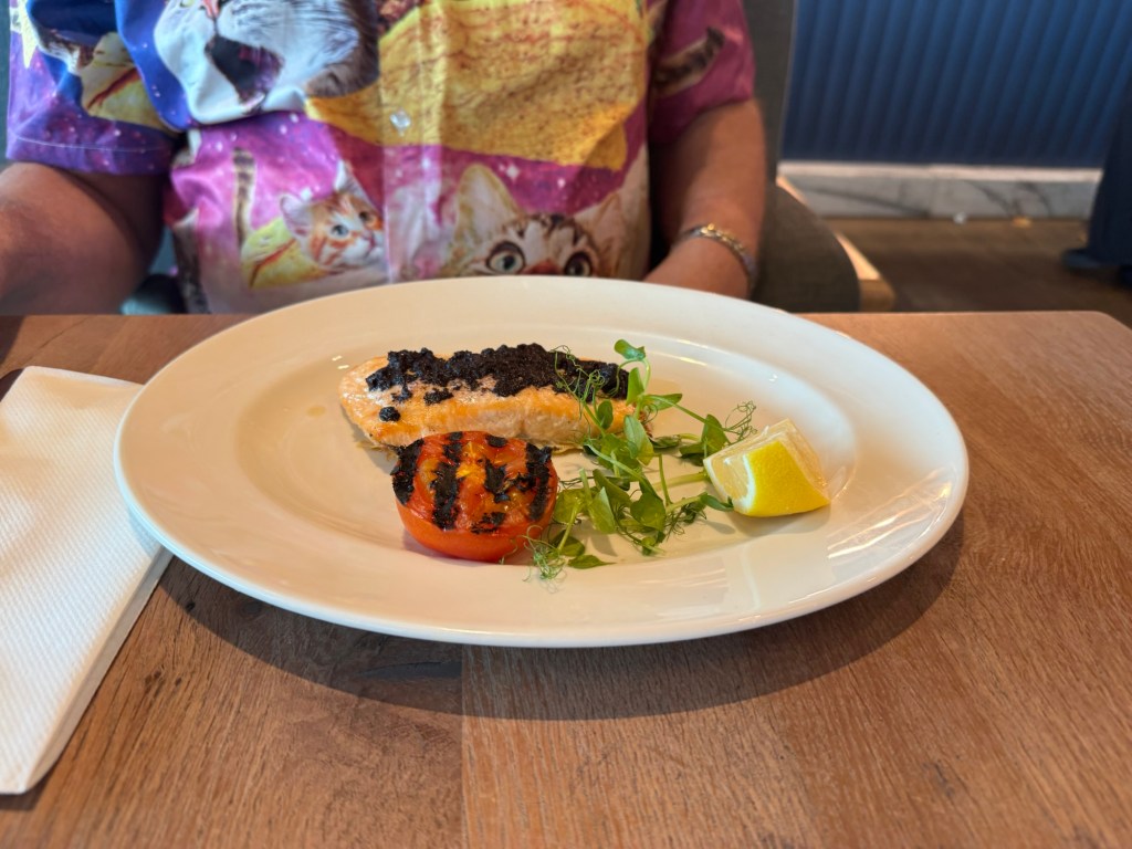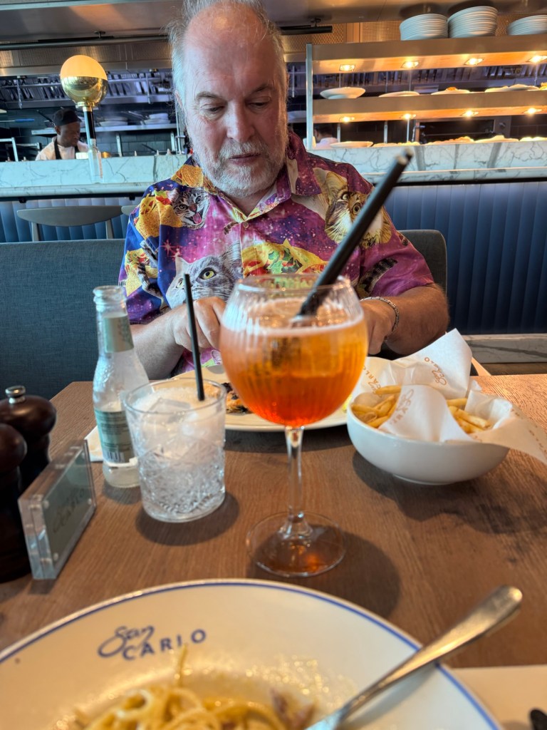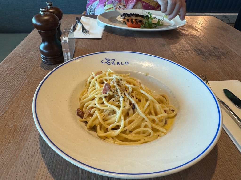 Even with all this fun and games, we had time for an early dinner. I picked San Carlo. After the delicious breakfast we had there in April, I was keen to try dinner. Graham had baked salmon fillet with black olive tapenade, served with sundried tomato, caper & parsley dressing. He ordered some fries to go with it. I was torn between a few options, but ultimately decided on Spaghetti Carbonara. We both enjoyed our food. I figured it would be a crime to go to an Italian restaurant and not have an Aperol Spritz. It also was a Friday and technically I was on holiday. Graham had an elderflower tonic. We both had some water. Ironically, our food came out before the drinks did. Still, we had plenty of time to enjoy our meal and drinks.