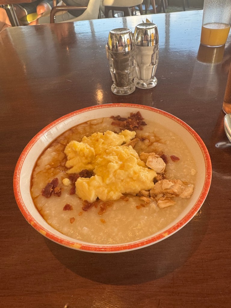 We decided to check out the Windjammer. Initially, we headed to the wrong deck. On every ship I have ever been on, the buffet is on the same deck as the pools. However, on Allure it is on the deck above. It was quite busy, but we had no issue finding a table. Graham had a pear and some oatmeal with dried fruit and brown sugar. I had congee with chicken, bacon bits, egg and soy sauce. I am sure there is some better congee in my very near future, but this hit the spot. We both had some coffee. It was not great, but it was not awful either.