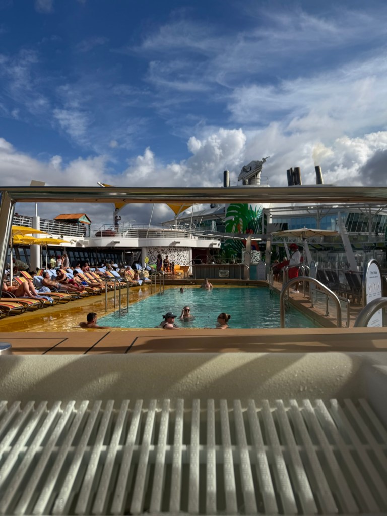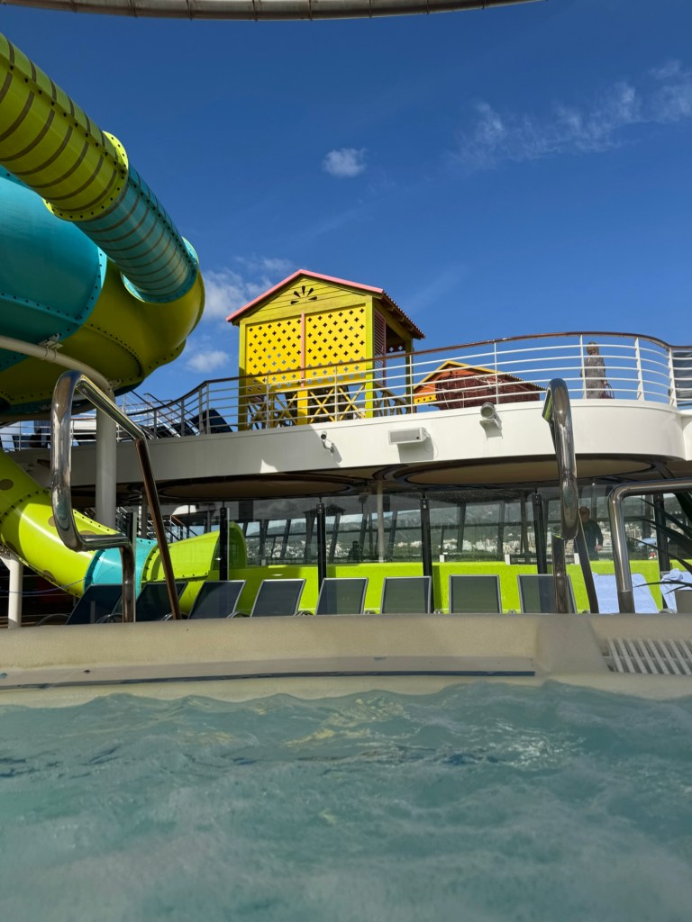 Graham joined me after a while and at some stage, we decided to check out the solarium pool. This is listed as a plunge pool on the deck plan. It was not hugely cold but definitely felt refreshing after the hot pool. In the centre was a structure that sprayed cool water on you. We both really liked this pool. However, for some reason, we never made it back. As I was walking past, I decided to check out the family pool, which was next to the beach pool. This was a much more pleasant temperature for swimming. I swam one length and then I got out. Graham had gone in search of towels while I tried out the family pool. I headed over to the towel station and did not see him anywhere. He came round the corner a couple of minutes later carrying two soft serve ice creams. We enjoyed those while we were drip drying. Then we got some towels and finished off the drying process before handing in the pool towels again.